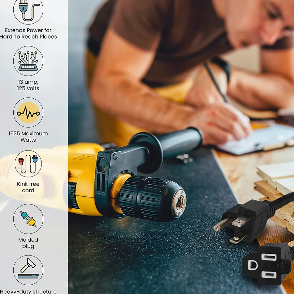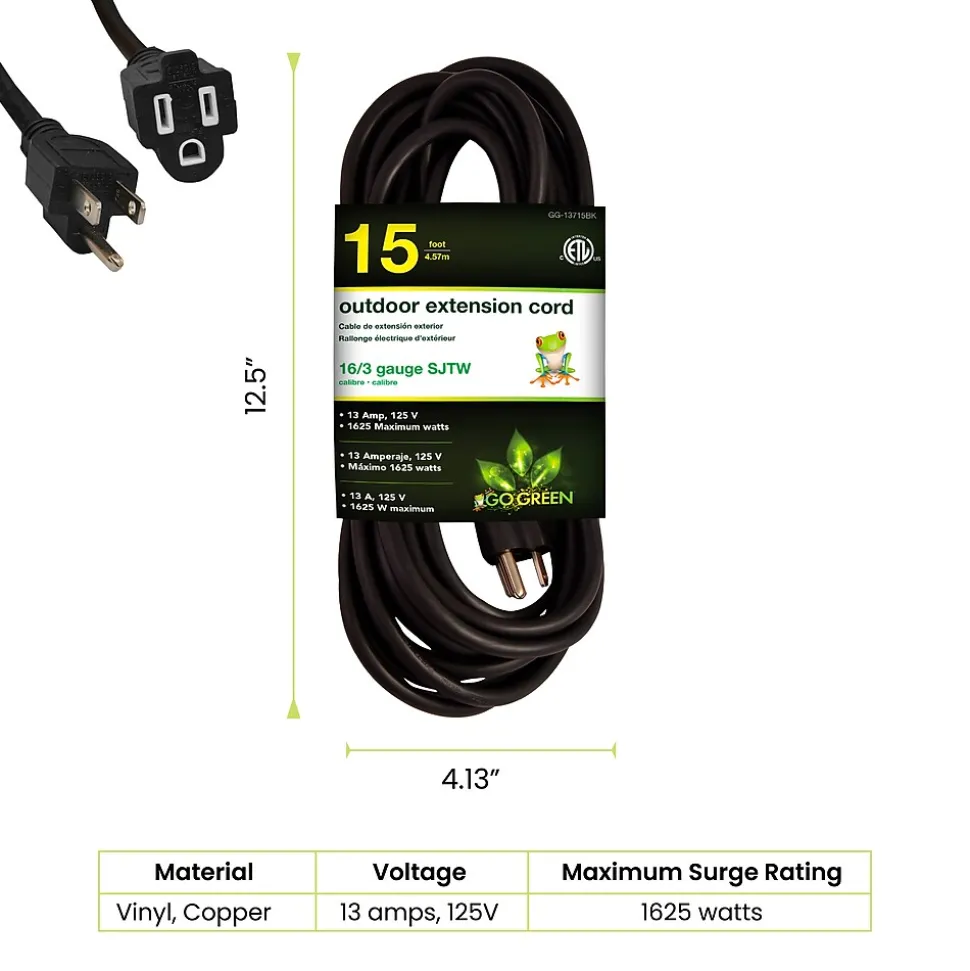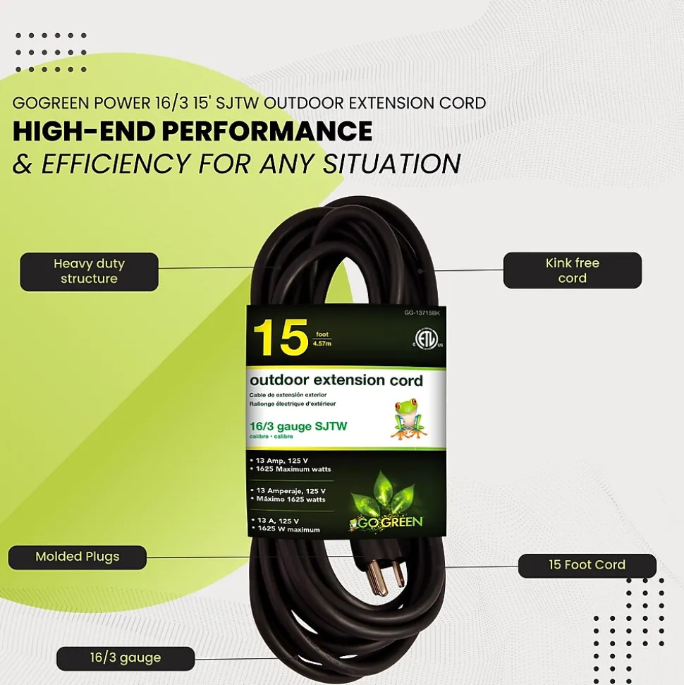 The GoGreen Power 156/3 extension cord will resist moisture, abrasion and prolonged exposure to sunlight for durability. Great for use around your garage and with other outdoor electrical devices.