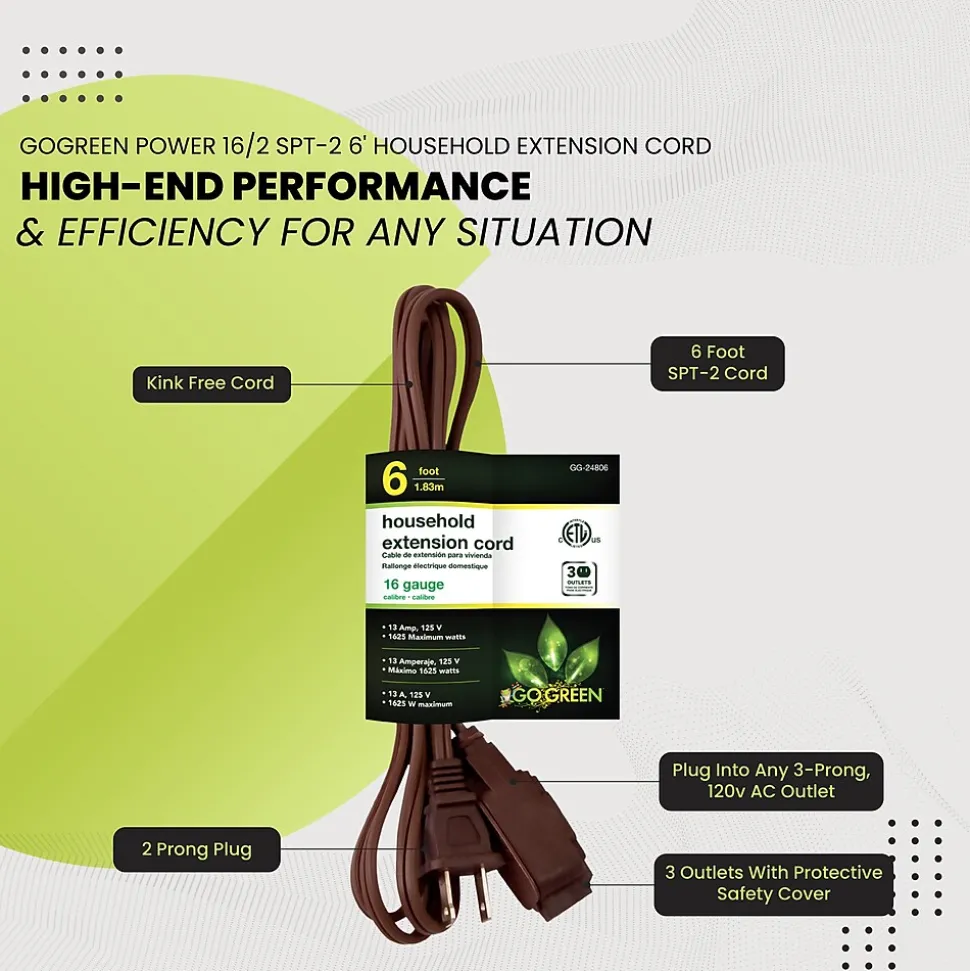 The GoGreen Power household extension cord is great for indoor use in the office and at home. Cord is industry approved and is ETL Listed