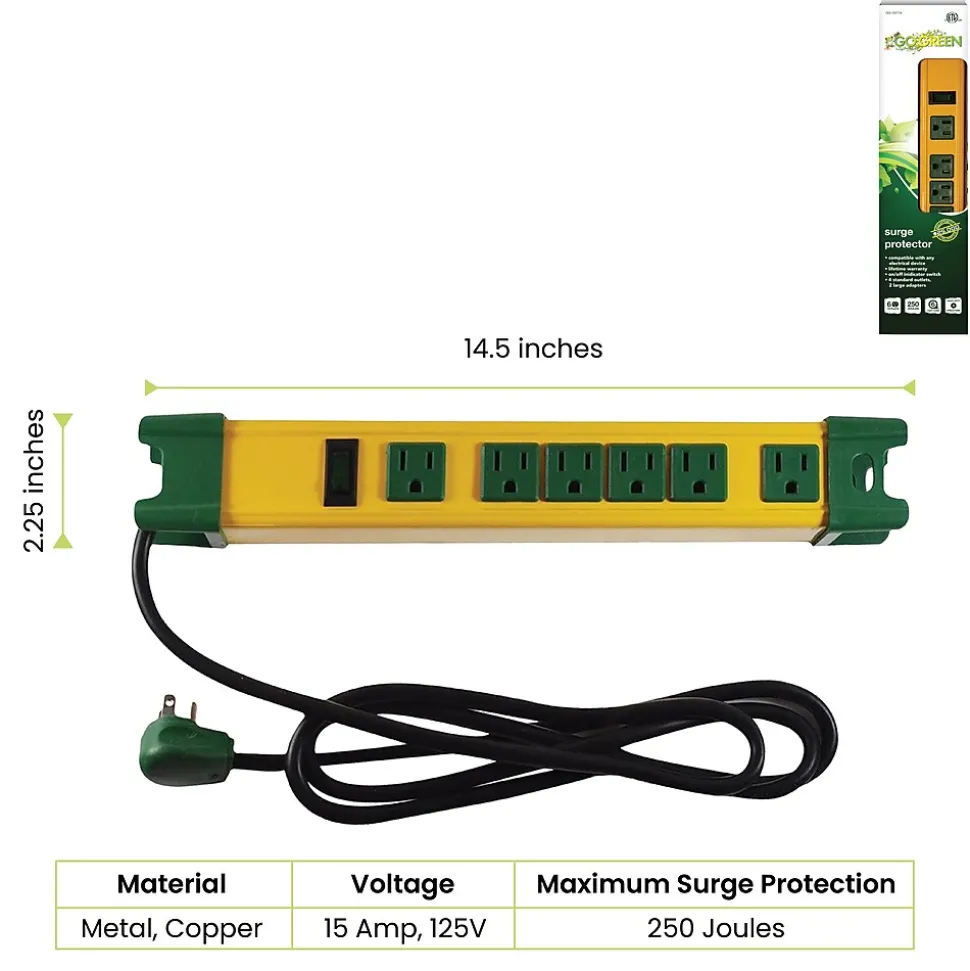 Environmental awareness meets peak performance in the GoGreen Power® 6-outlet metal surge protector. Providing 4 standard outlets, 2 large adapters, and sporting compatibility with any of the most valuable electronic devices, enjoy the benefits that keep on giving with this 100% recyclable product. With 250 joules of protection and a 15 amp circuit breaker, we’re sure to keep even the most valuable electronics safe from unexpected spikes.​A 6-foot power cord helps to ensure an extra outlet available wherever needed, while a built-in indicator light confirms operation so that customers can be sure that an errant electrical surge won’t turn their high-end devices into expensive paperweights. The lifetime warranty and free customer recycling program at iRecycled.com distinguish GoGreen as the leading lifestyle brand in the consumer electronics space. Leave your supplier troubles behind and join the recycling revolution today. The planet needs us all to GoGreen together!