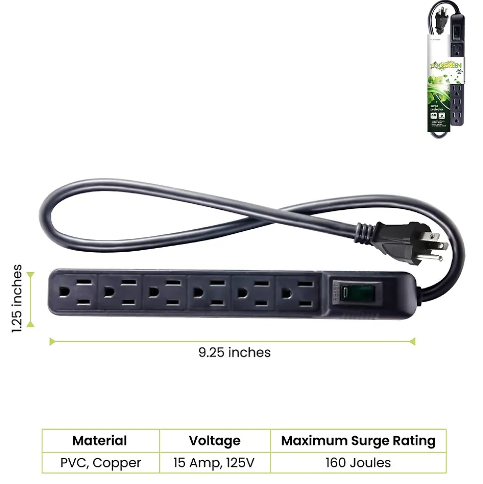 Most people have surge protectors laying around without realizing they are missing critical protection from power outages by storms or brownouts. Protecting your computers, televisions, home appliances, and more isn’t optional – it’s essential!With the GoGreen Power® 6-Outlet Mini Surge Protector, you won’t have to wonder if your devices are protected every time the lights flicker. This 15 amp, 1875 watt circuit breaker provides 90 joules of simultaneous protection for six adapters at once, making it a perfect accessory for your home office or entertainment center. With an active indicator light to confirm protection, the 6-Outlet Mini Surge Protector should be a standard feature in every room in your home.Bolstered by a heavy-duty case and cord, the GoGreen 6-Outlet Mini Surge Protector provides the environmentally-friendly design of all GoGreen products with high-end performance and efficiency for any situation.