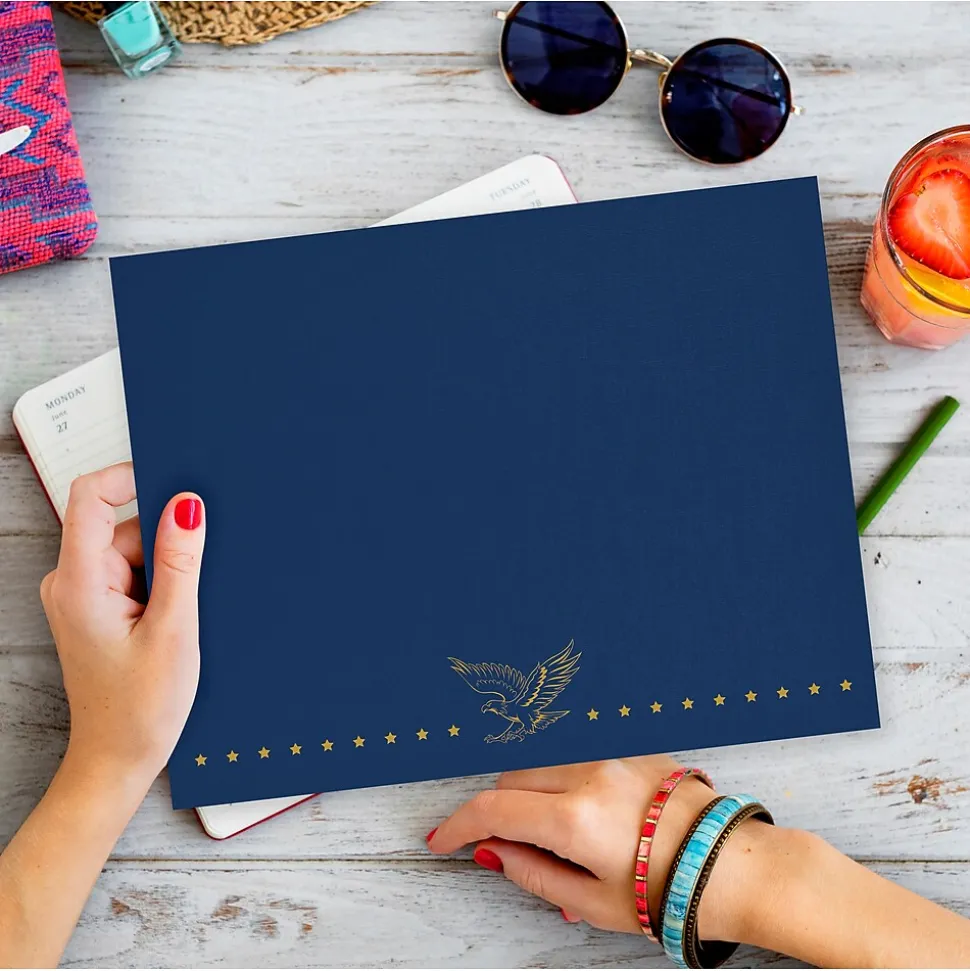 Great Papers!® Certificate Cover measures 12″ x 9.375″ is made of high quality cover stock with gold foil design for elegant look. Holder comes with 4 die-cut corners for easy placement of an 8.5″ x 11″ certificate or document.
