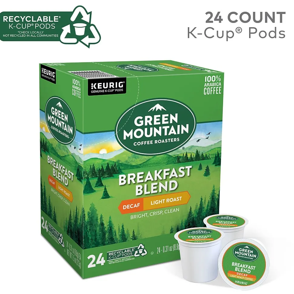 Brew a single cup of this decaffeinated coffee for a light roast option with a sweet, nutty flavor. Each pod works flawlessly with compatible Keurig brewers for simple setup. With no loose coffee or filters to worry about, brewing an individual cup of coffee is easy and convenient with these Green Mountain decaffeinated Keurig K-Cups. An eye-opening decaf as delightful as the dawn itself. Clean and bright, with balanced sweetness, nutty flavor, and a silky mouthfeel.