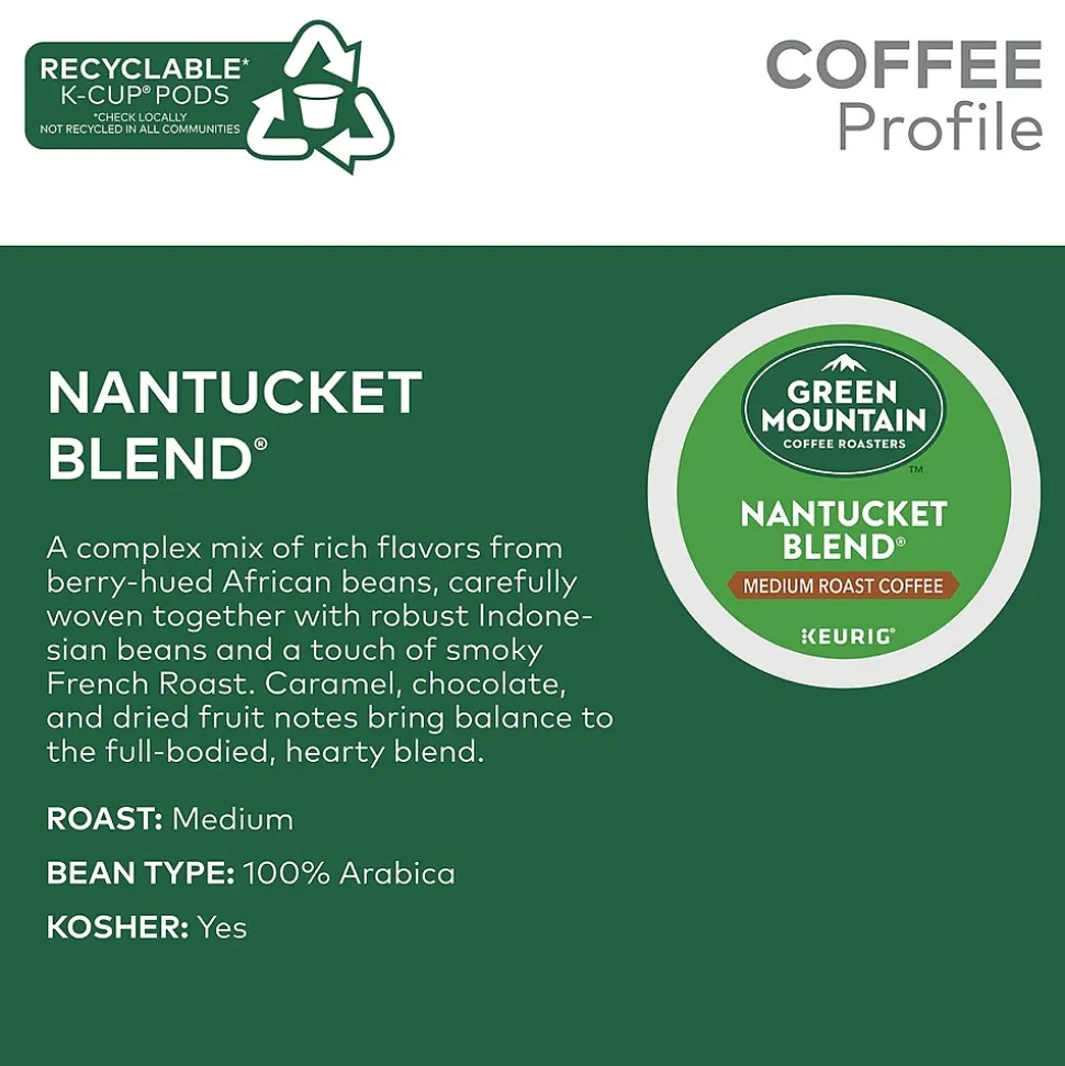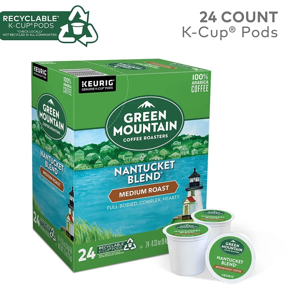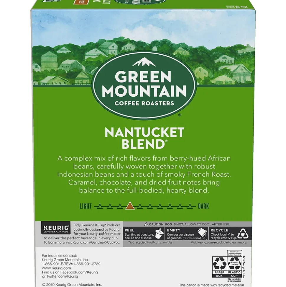 Start off the morning right with these Nantucket Blend Fair Trade Certified coffee pods. With a delicate mixture of a smoky French roast and robust Indonesian beans, these coffee pods offer a complex, bold taste. These Green Mountain Coffee Keurig K-Cup pods come in a 24-pack and have a complex mix of rich flavors from berry-hued African beans, carefully woven together with robust Indonesian beans and a touch of smoky French Roast. Caramel, chocolate, and dried fruit notes bring balance to the full-bodied, hearty blend.