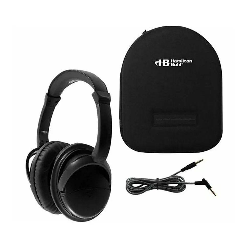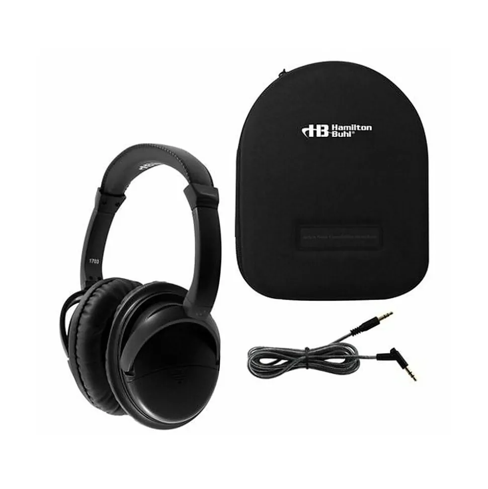 This pair of Hamilton Buhl Deluxe headphones is specially-designed to deliver superior noise cancellation by actively reducing harmful and annoying low-frequency sounds in noisy environments. The deluxe over-ear cups with soft cushions deliver passive noise suppression as well. Together, the passive and active noise-canceling technologies create a quiet, soothing environment to focus on the audio in your headphones or have some peace with no sound. Featuring an adjustable padded headband and a removable 5′ Dura-Cord that can be swapped out for a 5′ Dura-Cord with an in-line microphone to turn your headphone into a headset.