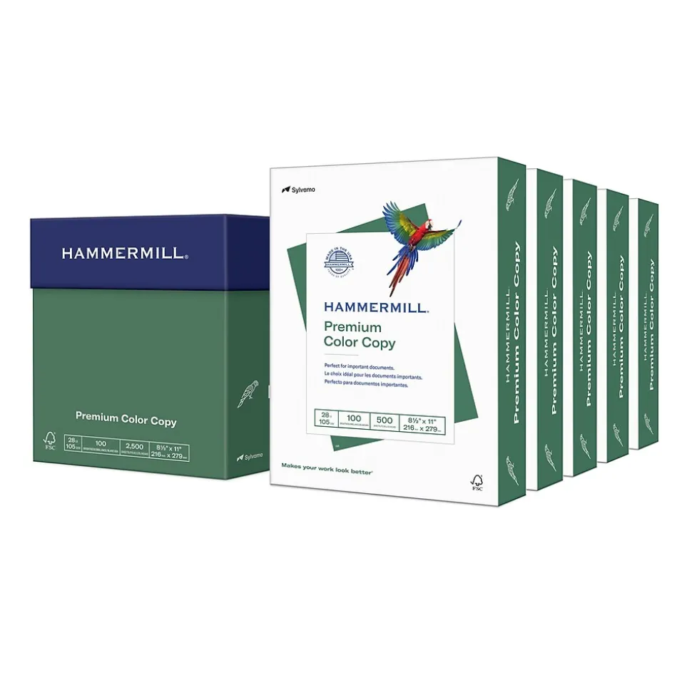 Put a professional finishing touch on documents with this Hammermill Premium color copy paper. The super-bright photo white finish is ideal for printing images and graphics, while the 99.99 percent jam-free guarantee ensures this paper runs smoothly through your copier or printer. This Hammermill Premium color copy paper boasts a 28-pound paper weight, preventing ink bleed-through while providing a convenient option for two-sided printouts.