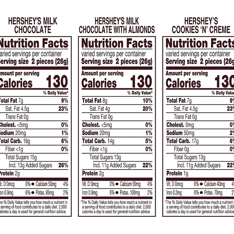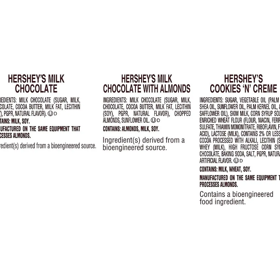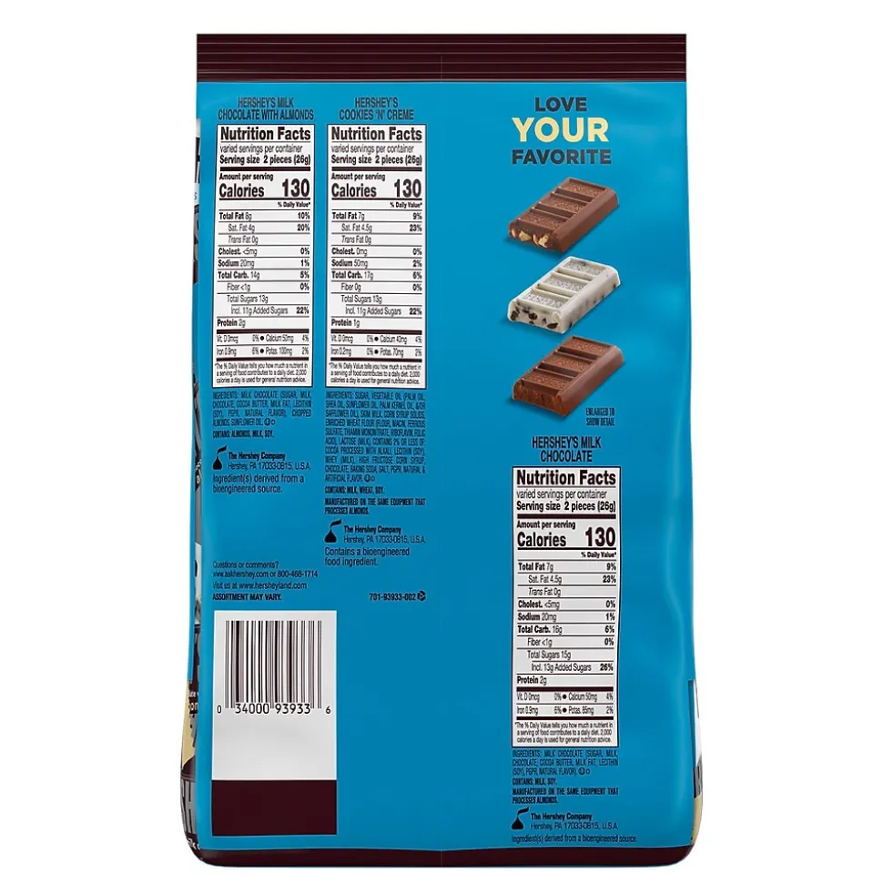 - Includes HERSHEY’S Cookies ‘n’ Creme white creme with cookie bits snack size candy bars, HERSHEY’S milk chocolate snack size candy bars and HERSHEY’S milk chocolate with almonds snack size candy bars