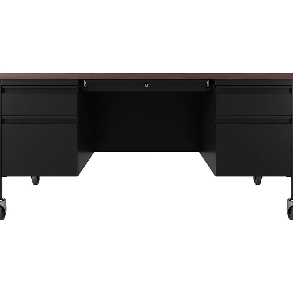 Double pedestal teachers desk that provides a practical desk solution to any educational environment. The T-mold edge promotes safety while the laminate provides a durable scratch and stain resistant surface that is easy to clean. Four casters add mobility and allow for easy classroom reconfiguration.