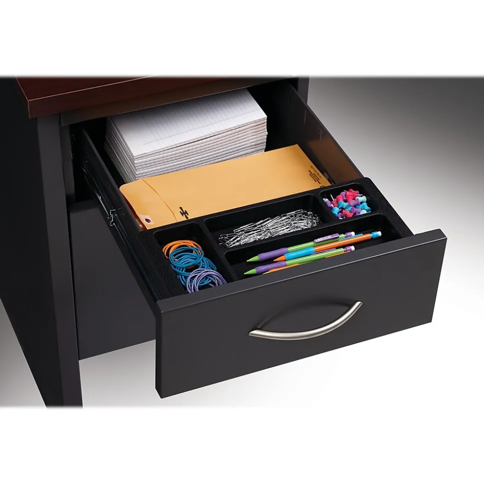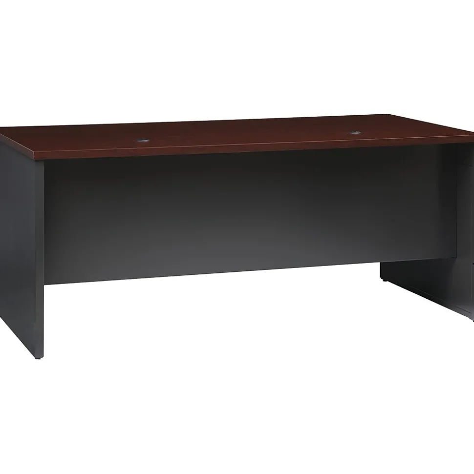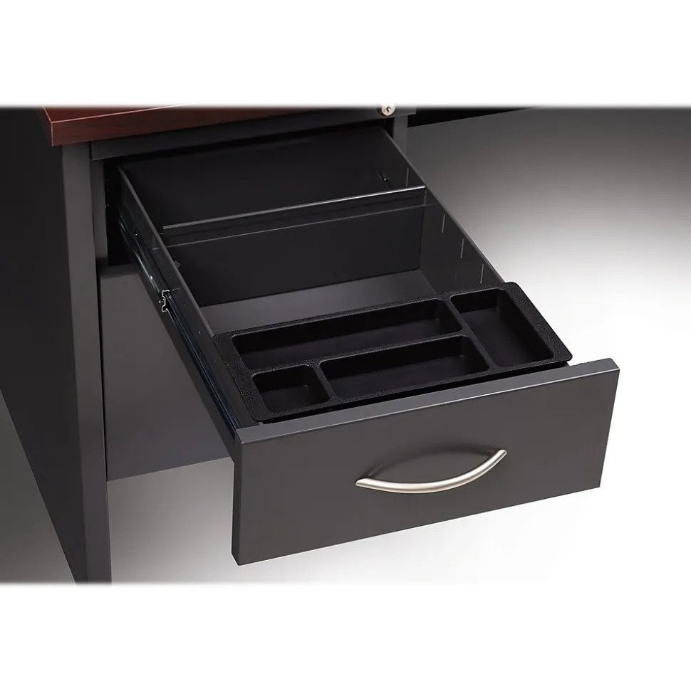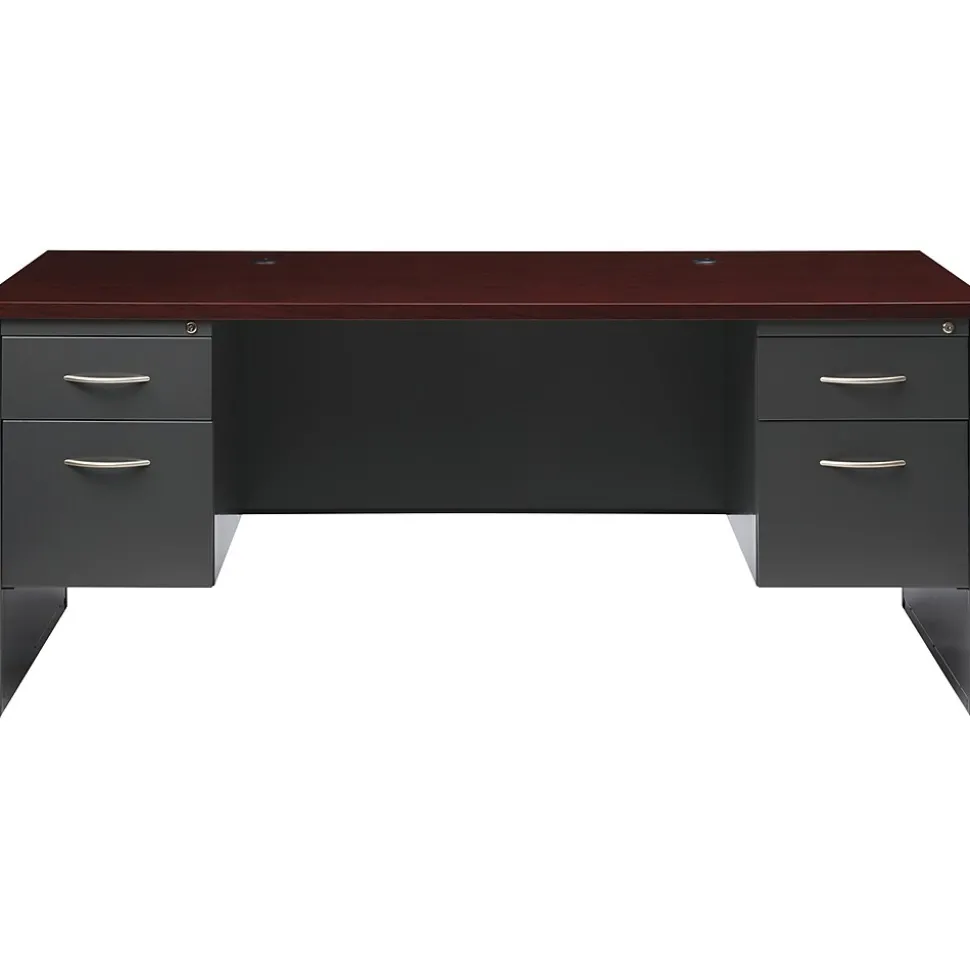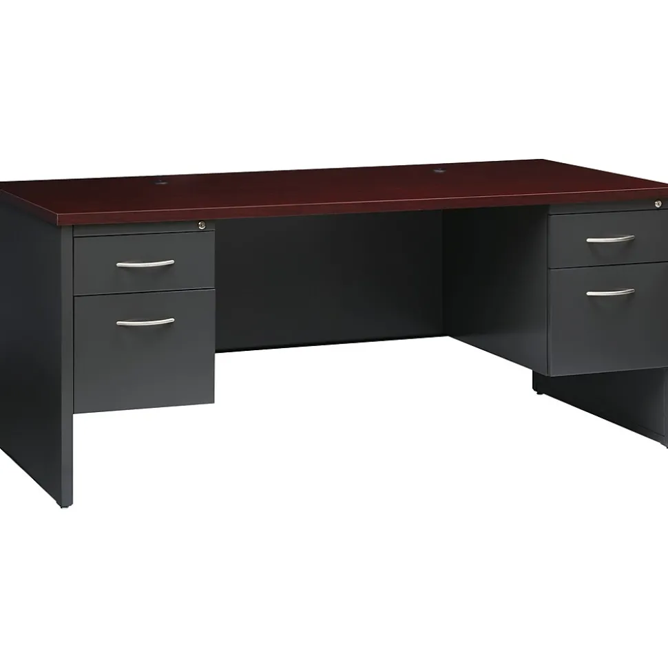 Modular double pedestal desk. Includes a core removable lock and Central locking system. Box and file drawers feature full extension slides and premium satin nickel Arch pull handles. Precision ball-bearing suspension. Durable laminate work surface with grommet holes for cord management. Radiuses profile edge banding for enhanced comfort. Full height end panels with leveling glides. One pencil tray standard per desk and one drawer divider standard per box drawer. Meets or exceeds ANSI-BIFMA standards and contains up to 28percent recycled material. This desk is a part of our Executive Modular Desk Collection.