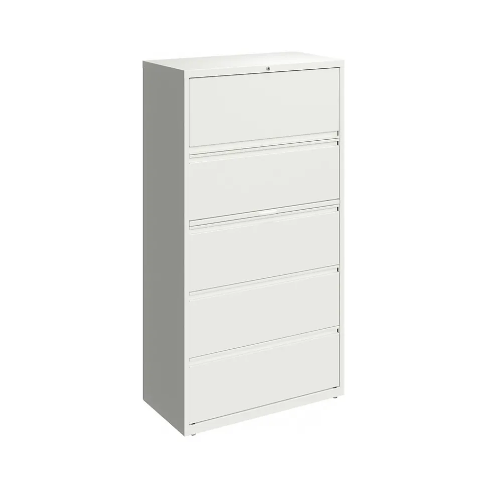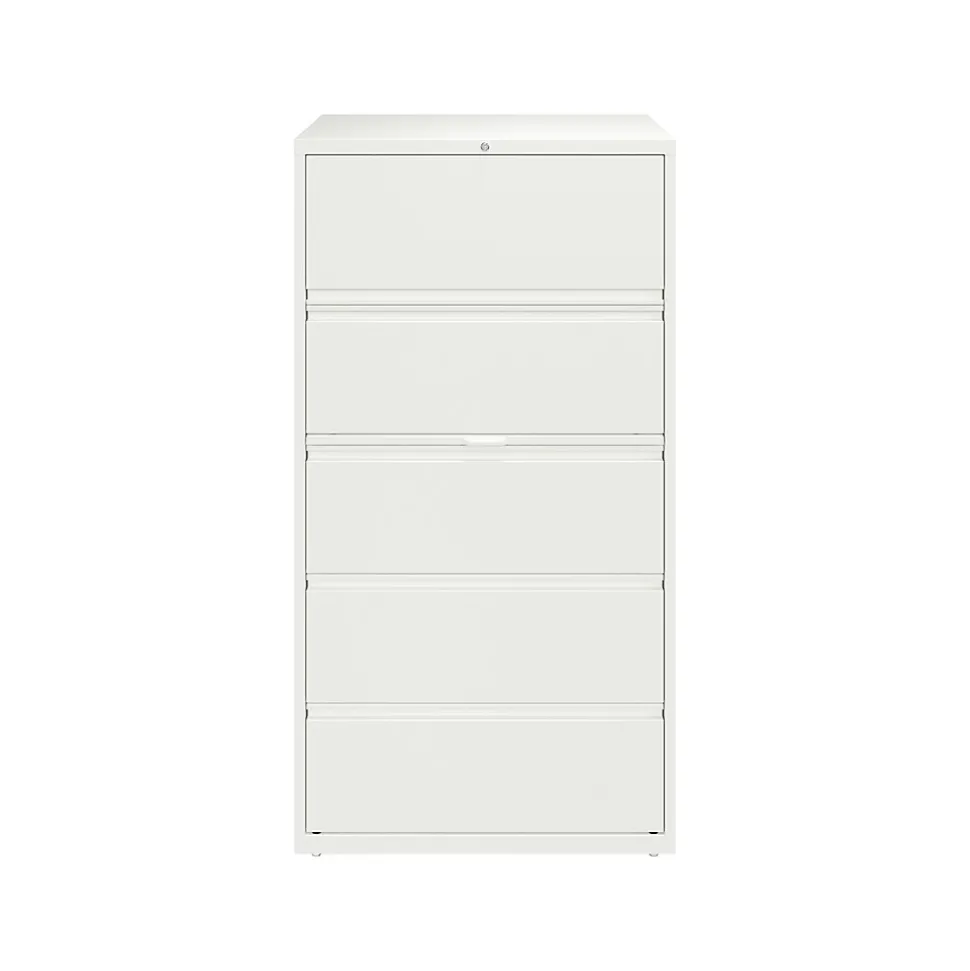 - Five-drawer lateral file cabinet holds letter-, legal-, or A4-size documents