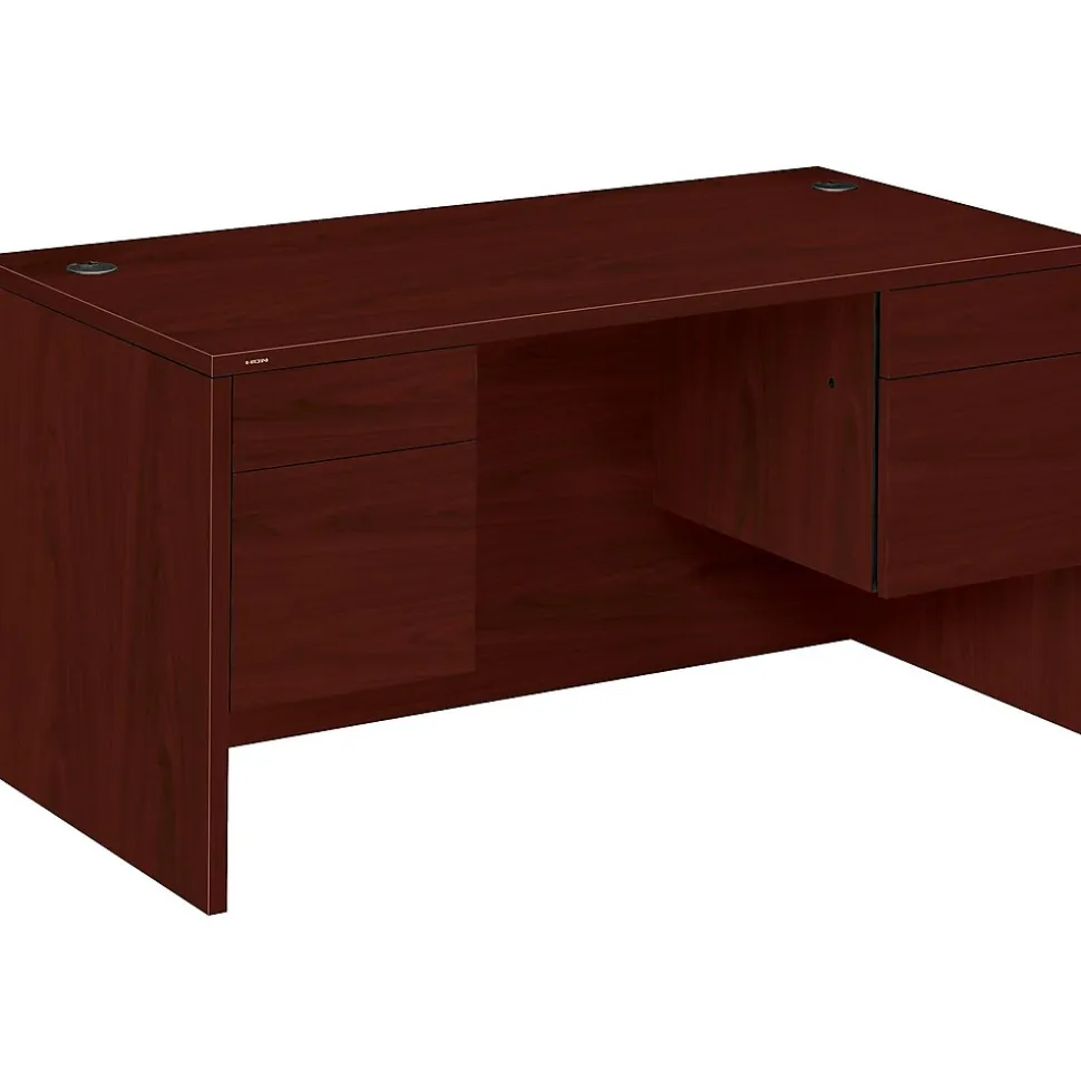 Revamp your office with the addition of this HON 10500 Series office suite double pedestal desk. Clean lines and a simple silhouette give this desk a contemporary look, and a rich mahogany finish adds a hint of sophistication to your office or cubicle. Each pedestal features reinforced construction to withstand daily use, so you can feel confident filling each drawer with files and supplies. Two file drawers make it easy to sort client files and daily paperwork, while two box drawers provide storage space for small items to keep clutter off the work surface. Built-in hang rails inside the drawers give you a ready-to-use filing system for hassle-free setup. These drawers feature durable locks that all open with the same key, keeping your items secure when you are away from your office. The high-pressure laminate work surface resists spills and scratches for long-lasting good looks. Featuring two thoughtfully spaced cable management openings, this HON 10500 Series office suite double pedestal desk offers flexible placement options for your phone, computer, and peripherals.