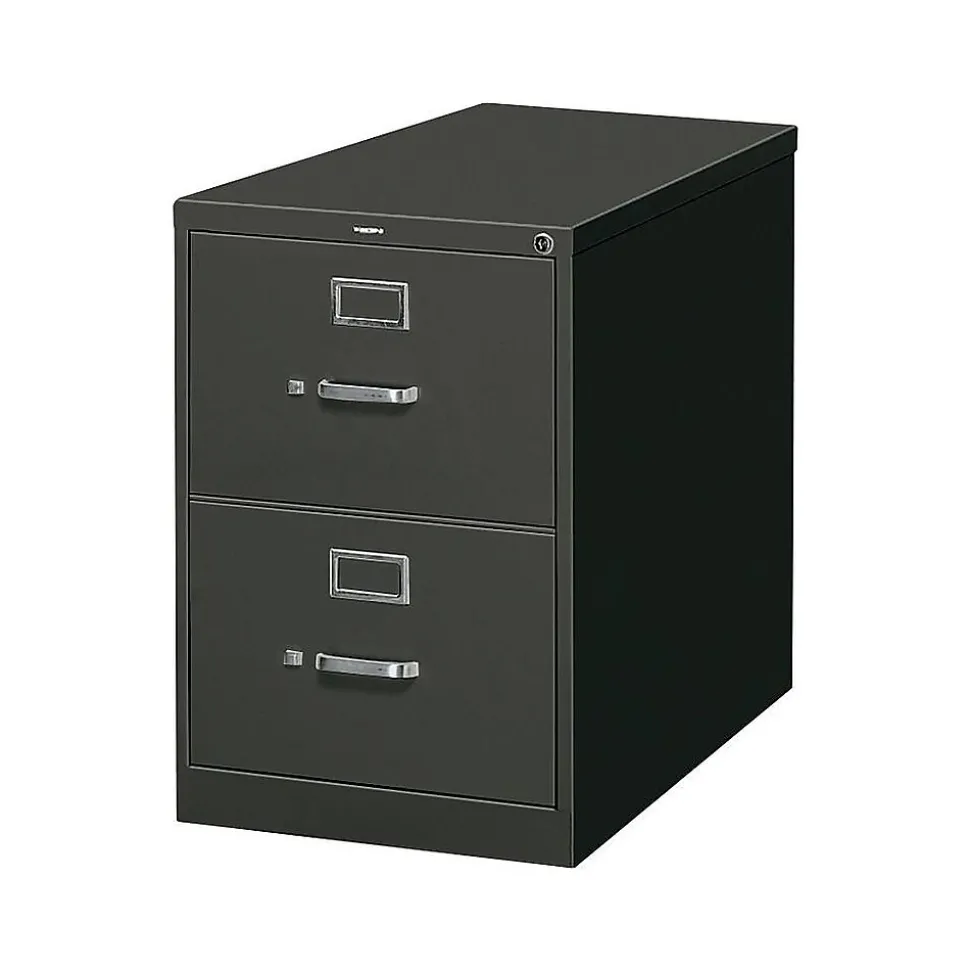 Get legal-size and other documents well-organized in this two-drawer filing cabinet. Built-in label holders let you easily identify stored records, and a tilt and slide follower block in each drawer keeps files upright and neat. This HON 310 series vertical file cabinet has thumb latches and a replaceable lock for secure closure, and the steel ball bearing suspension system lets the drawers glide smoothly.