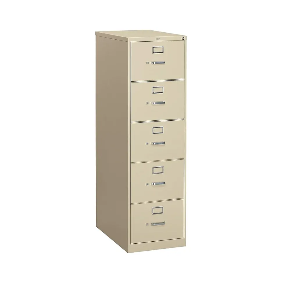 Provide secure, organized storage for important contracts and documents with this five-drawer file cabinet. Removable, interchangeable One Key core locks limit access to authorized personnel, and the high drawer sides easily fit hanging folders without the need for extra handrails. With an all-welded steel frame construction and four vertical reinforcements, this HON file cabinet holds up to rigorous daily use.
