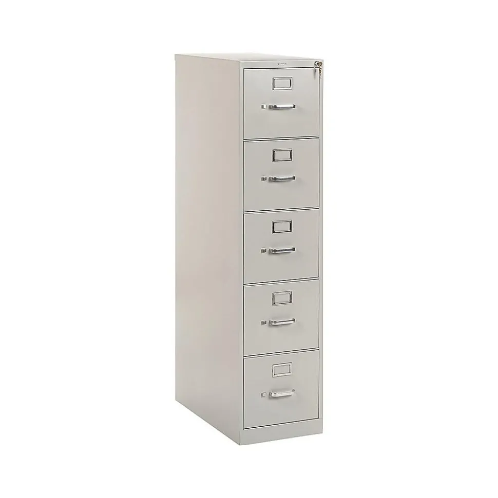 - Five-drawer vertical filing cabinet holds letter-size documents