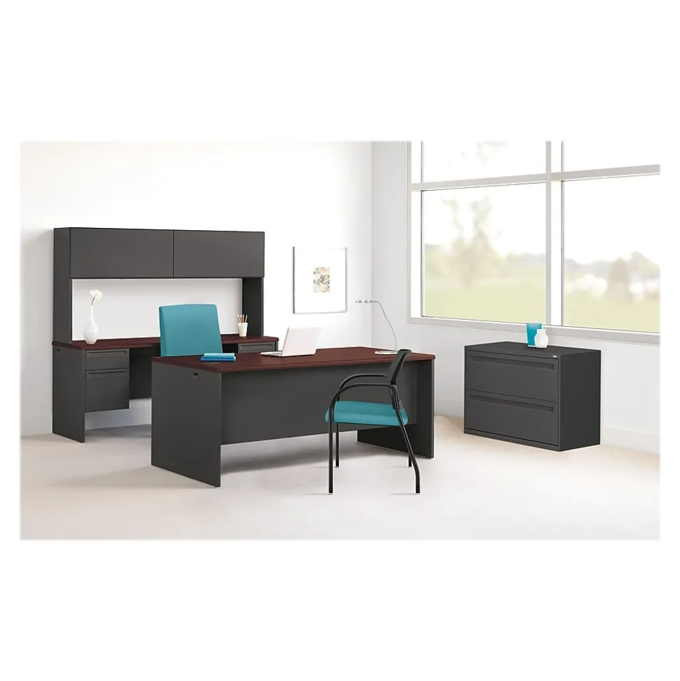Store office accessories, folders, and other items easily in this double-pedestal desk. Featuring a waterfall edge, this workstation makes typing more comfortable, while the steel construction enhances durability and allows for frequent relocation. Each pedestal features a box drawer for supplies and a file drawer for paperwork, so you can access important reports, contracts, and other documents quickly. This HON 38000 Series double-pedestal desk has a multi-ply laminate surface, making cleanup easy and preventing scratches, dings and other damage.
