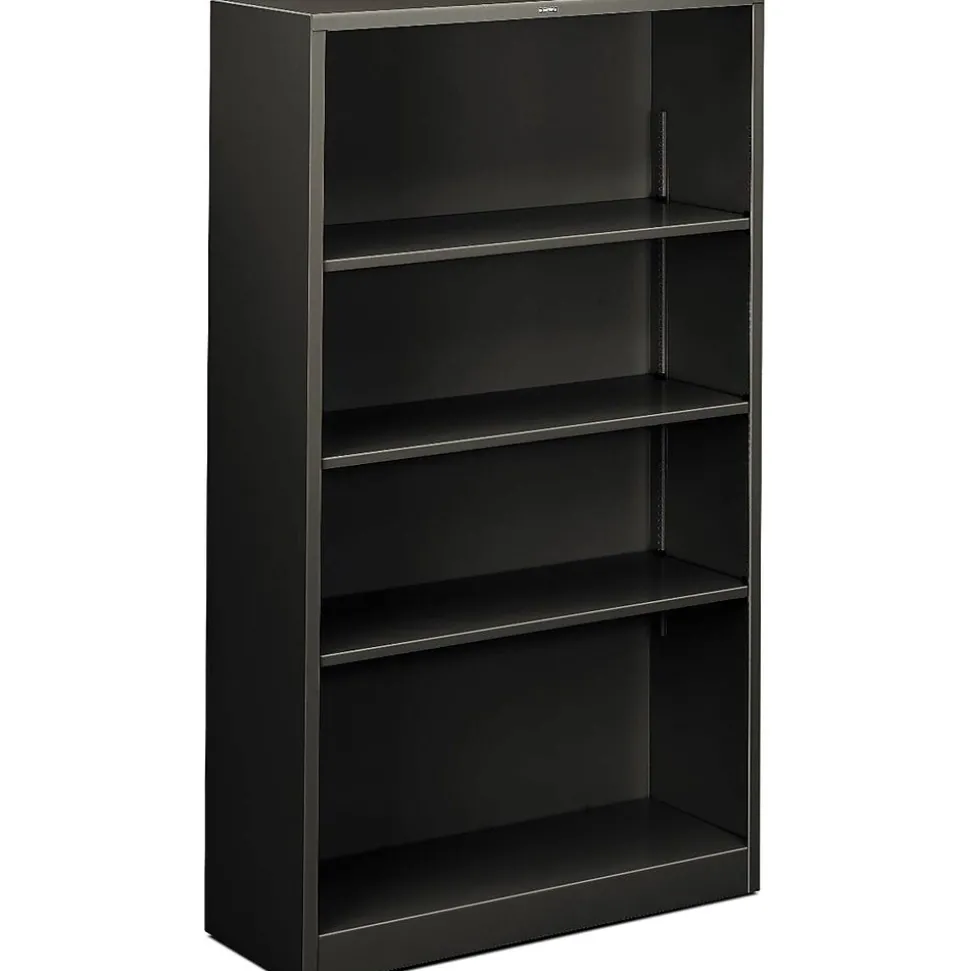 HON Brigade Metal bookcase in charcoal color measuring 59″ x 34 1/2″ x 12 5/8″ has 11 3/4″ deep shelves that adjust in 1/2″ increments to hold any size item safely. Bookcase with four shelves has a heavy-duty construction for durability.