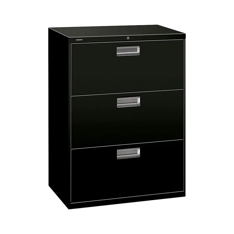 - Three-drawer lateral filing cabinet holds letter- or legal-size documents