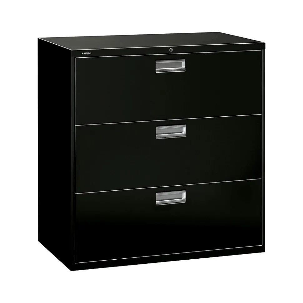 Keep paperwork organized with this HON 600 series three-drawer lateral file cabinet. Its durable steel frame can stand up to everyday use, and the three drawers operate smoothly and quietly thanks to ball bearing suspensions, while a mechanical interlock prevents multiple drawers from opening at the same time. With a two-sided lock mechanism and removable lock core, this HON Brigade 600 series lateral file keeps sensitive documents securely tucked away.