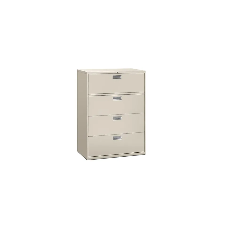 Create a more efficient filing system with this HON Brigade 600 Series lateral file cabinet. Four large drawers accept letter and legal documents for flexible storage options, and a mechanical interlock prevents more than one drawer from being opened at the same time. A removable core lock system provides added security for sensitive documents. This HON Brigade 600 Series lateral file cabinet features all-welded case construction for strength and durability.