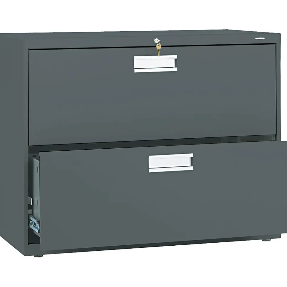 HONĀ® Brigade⢠600 Series Lateral file cabinet in charcoal color is constructed from 30 percent post consumer materials. Lateral file cabinet measuring 28 3/8″ x 36″ x 19 1/4″ features two drawers for storing the files up to 2.96 cu. ft.