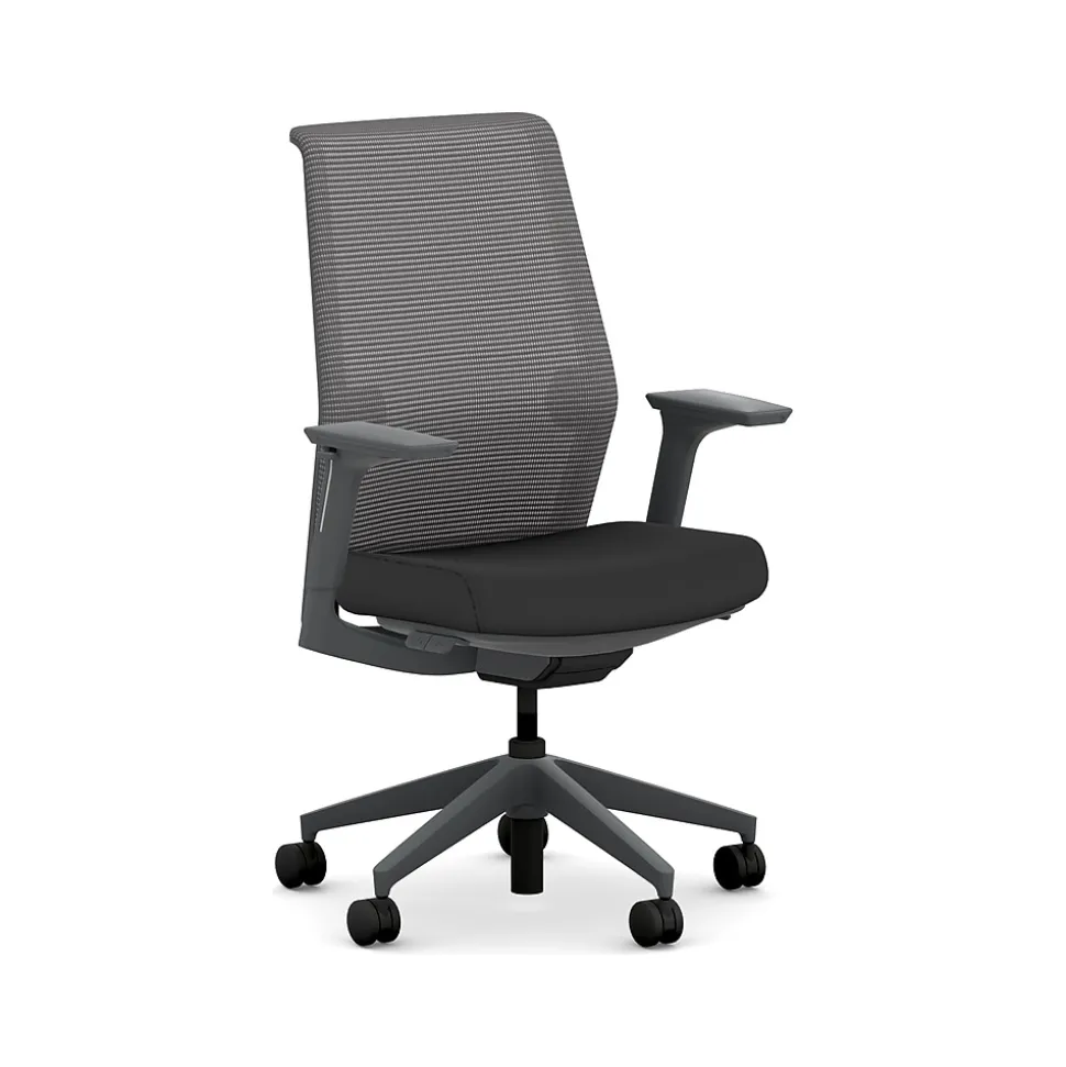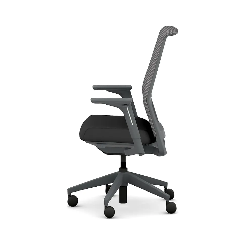 - Four-way stretch mesh back in charcoal gray, Centurion black fabric seat, and charcoal gray frame