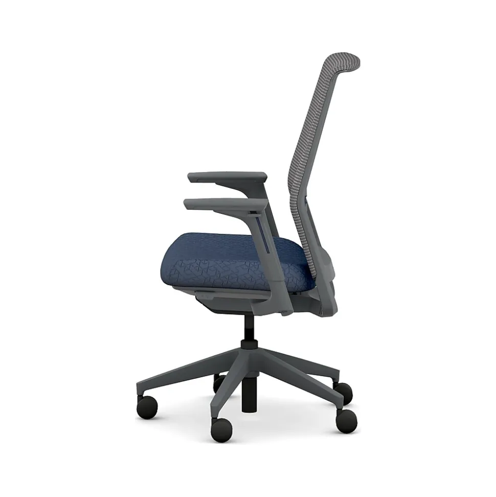- Four-way stretch mesh back in charcoal gray, Apex navy fabric seat, and charcoal gray frame