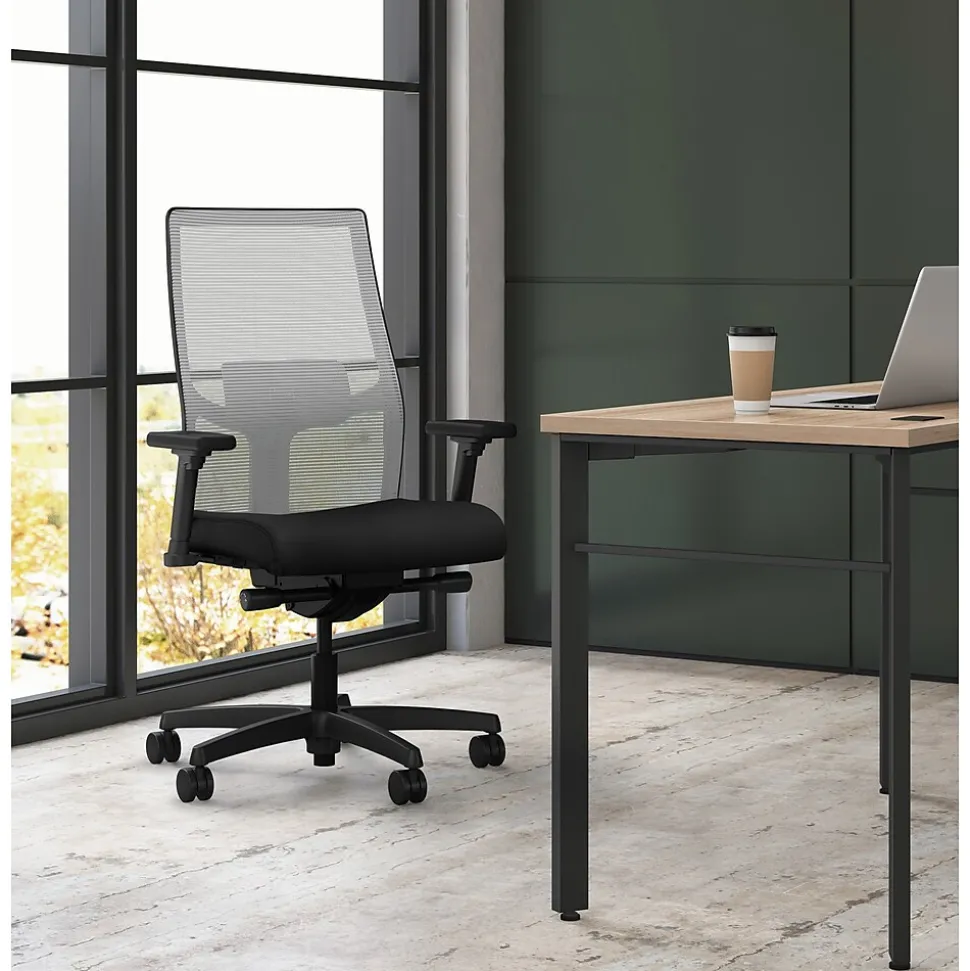Feel supported throughout the day with this black mesh office chair. This chair features fully adjustable arms and a synchro-tilt mechanism to allow shifts in seat height and recline angle that fully accommodate individual preferences. The mesh backing is flexible and breathable, allowing free air movement, and the contoured seat makes this chair a comfortable choice for long periods of sitting. Designed with hard caster wheels, this HON Ignition 2.0 task chair rolls smoothly and quietly through any workspace.