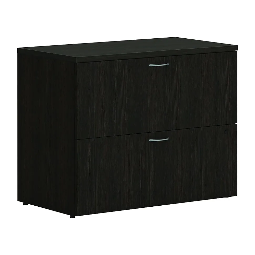 - Two-drawer lateral file cabinet holds letter- or legal-size documents