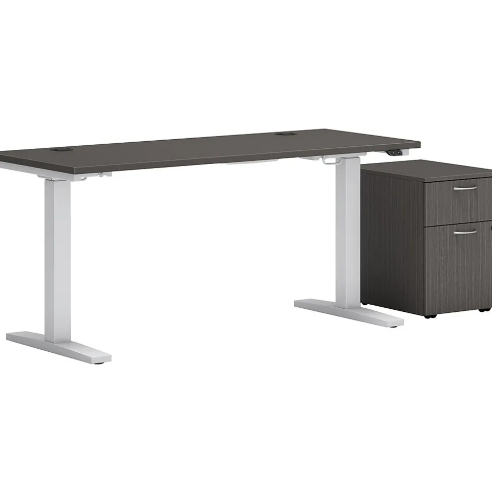- Sit down or stand tall with this sleek height-adjustable desk with mobile storage
