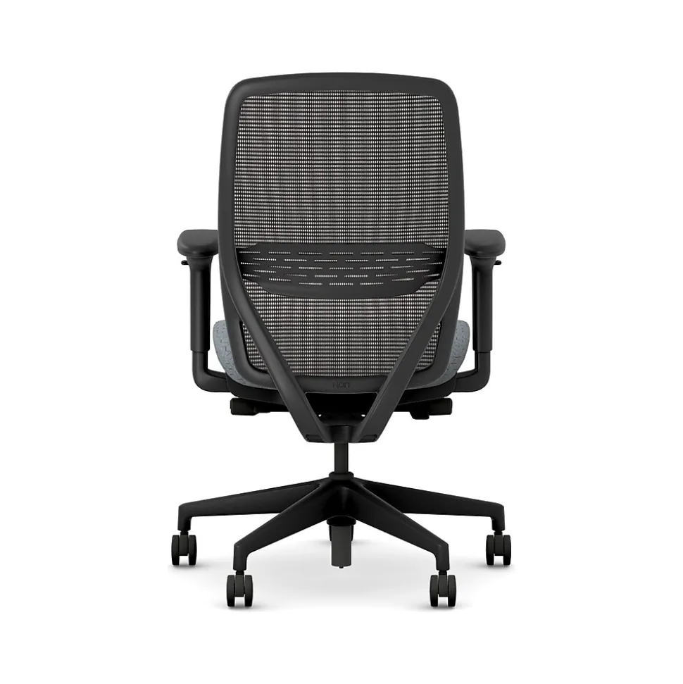 - Four-way stretch mesh back in black, Apex Basalt gray fabric seat, and black frame