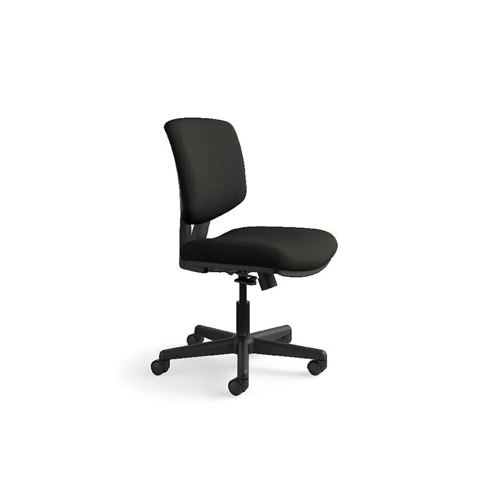 Create a comfortable and modern seating arrangement for your office with this HON Volt task chair. The armless design makes it easy to get in and out of the seat, while the SofThread leather upholstery adds a rich, inviting texture. Contoured seat cushions conform to your body for exceptional support throughout the workday. This chair features a synchro-tilt mechanism, providing a perfect height-to-angle ratio, so you can lean back while still enjoying proper back alignment. A pneumatic seat height adjustment lever lets you move the seat to match your desk setup, and the upright tilt lock keeps you sitting at attention when working on critical projects. Featuring a five-star base with rolling casters and a compact design, this HON Volt task chair offers effortless mobility.