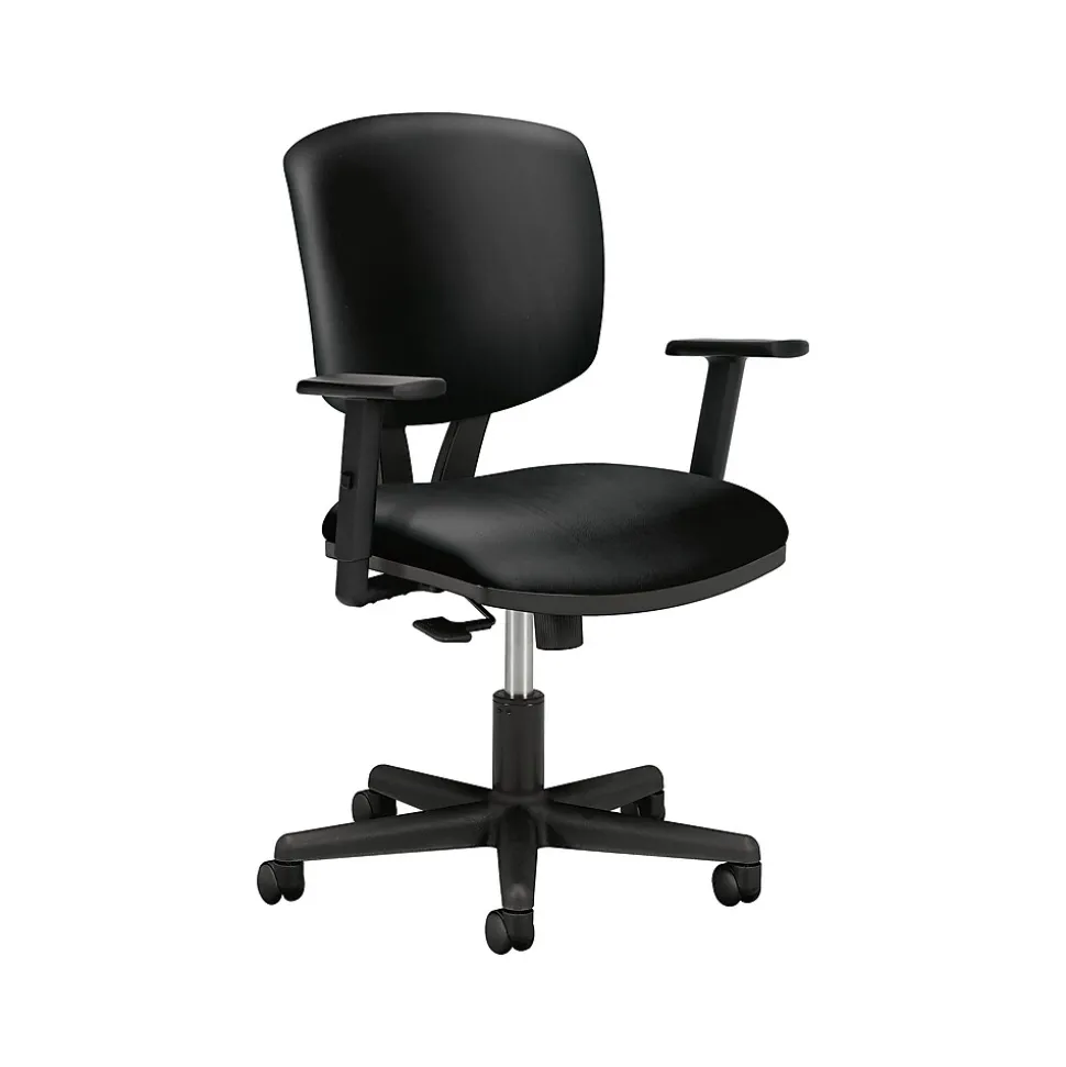 Update workspaces with this low-back office chair that features a lock and height-adjustable arms for customized preferences. This chair’s contoured, ergonomic design provides optimum lumbar support and stability for sitting up straight without undue strain. The synchro-tilt design controls the chair’s reclining mechanism for a more natural positioning. This sculpted office chair sits on five casters that allow for convenient mobility on any interior surface, including carpeting. As an added benefit, this HON Volt adjustable leather task chair features SofThread leather that is soft and durable for daily use.