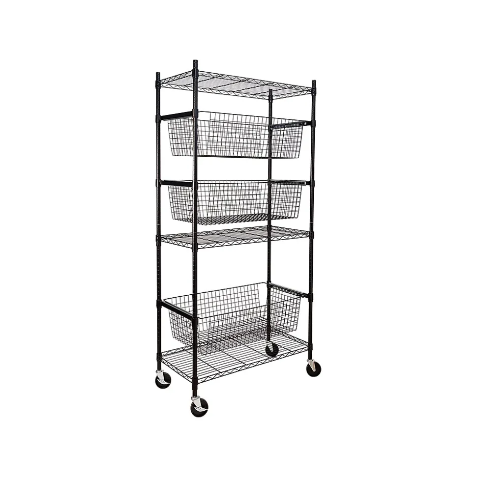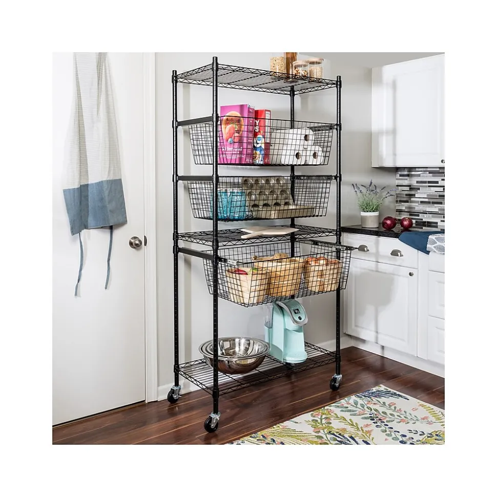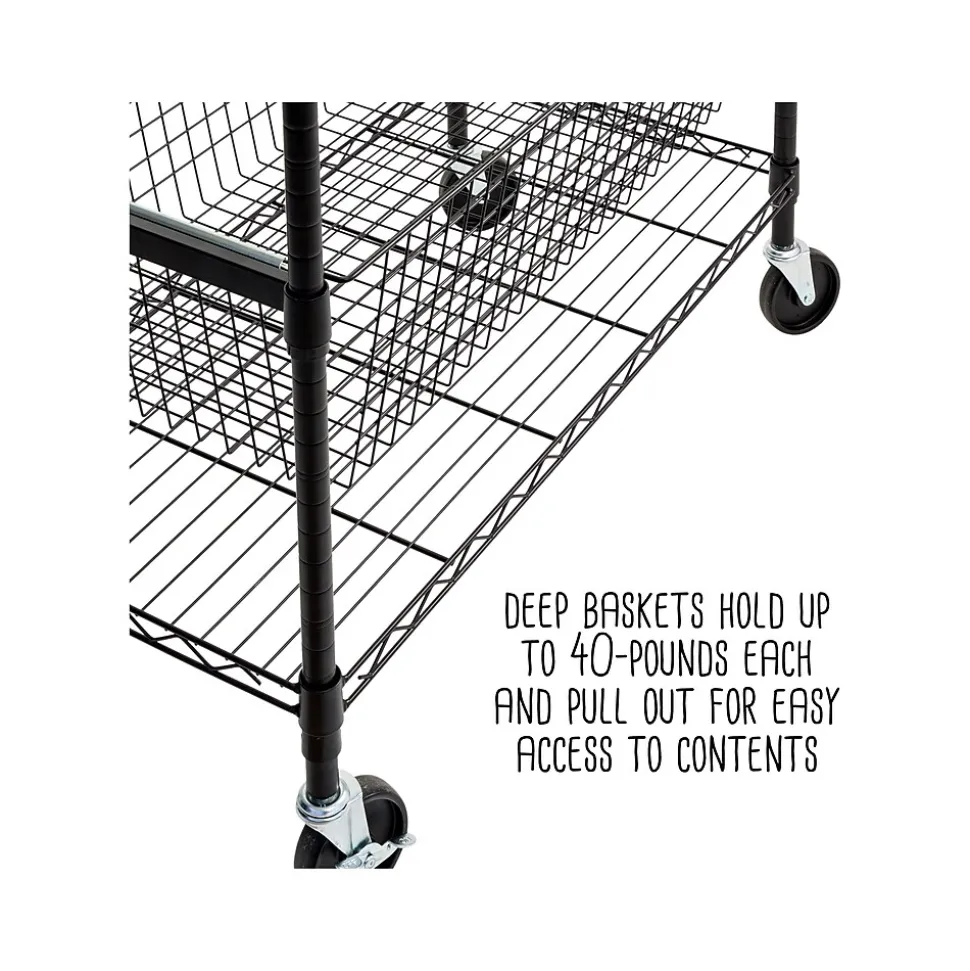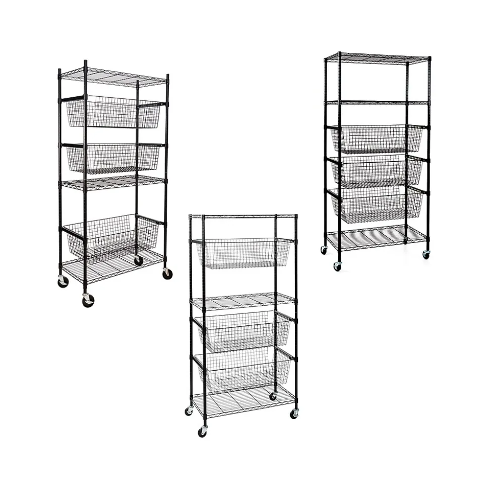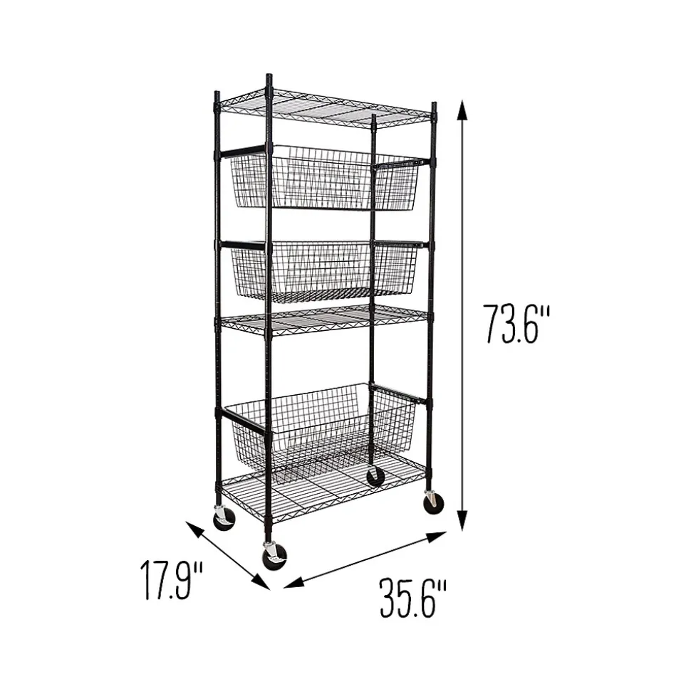 - Heavy-duty shelves hold up to 200 lbs. each, while deep baskets hold up to 40 lbs. each