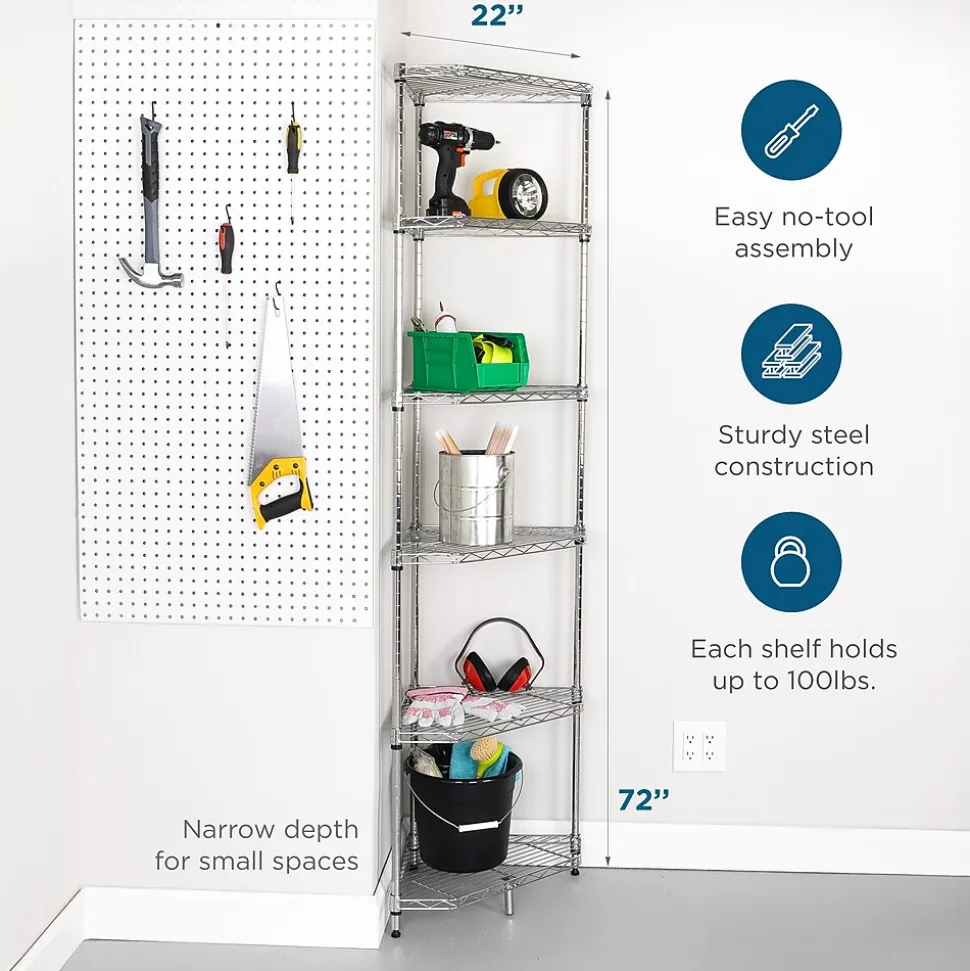 Take back your space with the 6-Tier Compact Triangle Corner Shelving Unit, designed to fit into even the smallest corners. With a unique triangular shape and 16-inch deep edges, this shelving unit offers ample storage without intruding into your living space. No bumping in hard corners when you walk by. Each of the six shelves supports up to 100 lbs, making it perfect for storing a variety of items. Easy to assemble with no tools required, this rust-resistant steel unit features leveling feet and plastic couplers, ensuring stability and durability. Ideal for adding functional storage to corners, this unit helps you organize your home efficiently and stylishly.