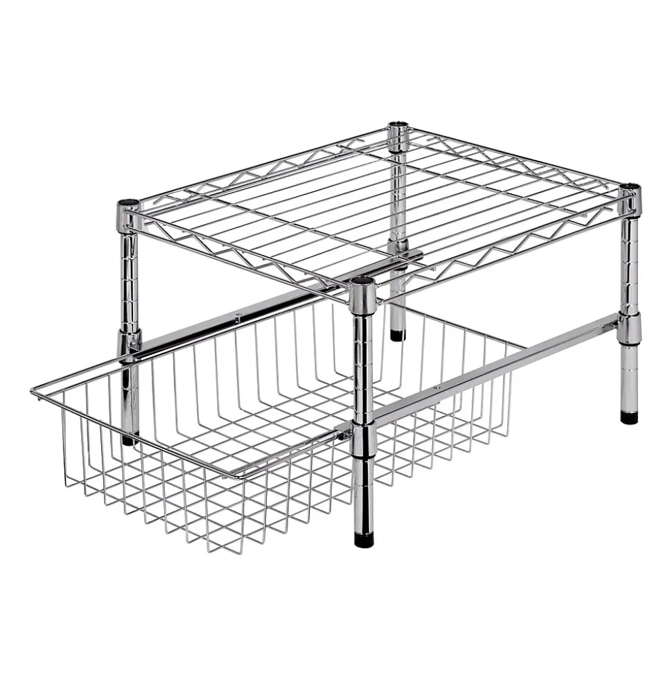 Honey-Can-Do SHF-04058 Adjustable Shelf with Basket Cabinet Organizer, Chrome. A flexible storage solution that adjusts in height to accommodate tall or shorter items in most cabinets. The contemporary design and brilliant chrome finish present a polished look when you open your cabinets. Handy and sizable, the wire basket pulls out for easy access to the contents inside and can be made to be removable, if desired. Measures 17.5″ x 11.75″ x 10.5″.