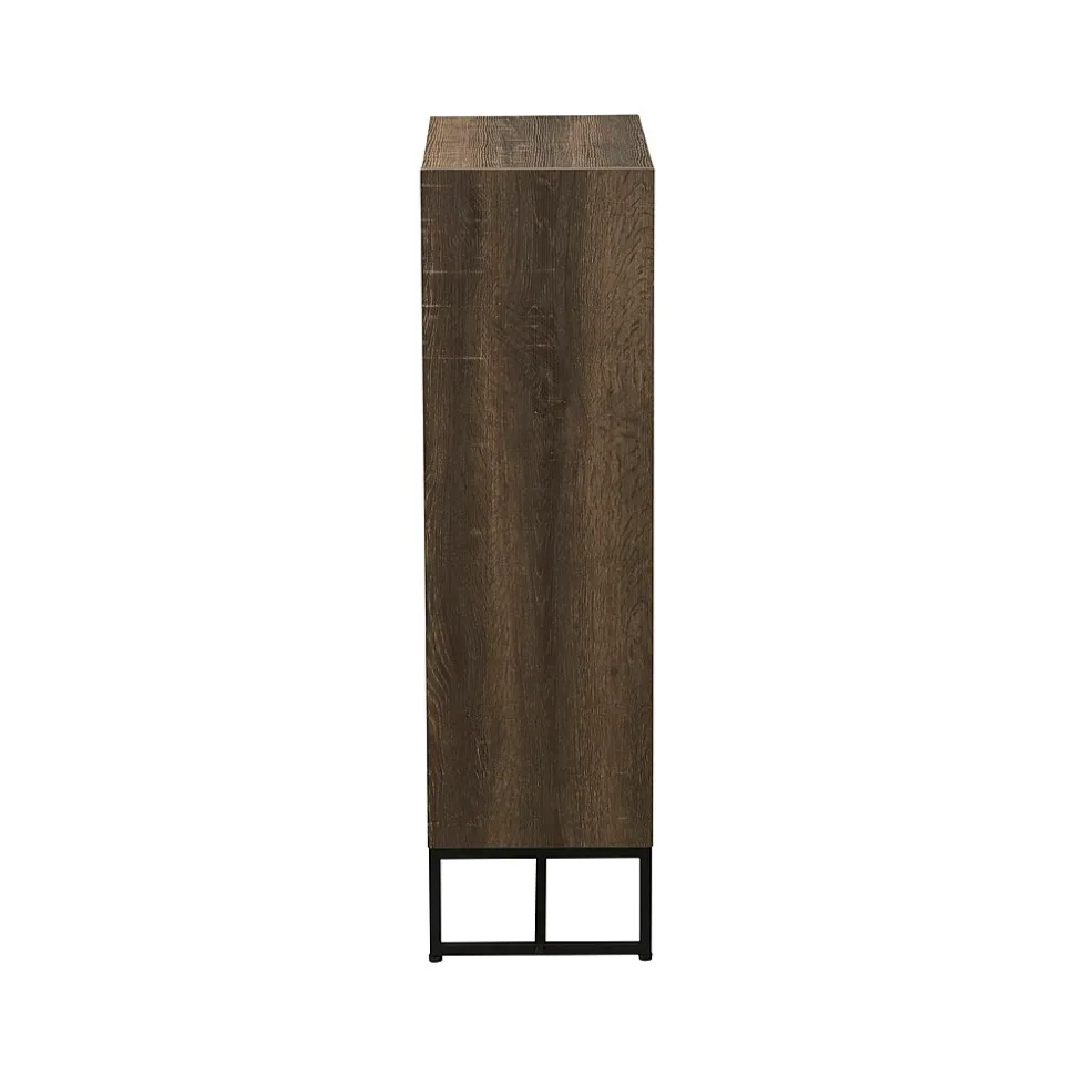 - Bookshelf is designed with small spaces in mind; comes with durable black steel legs and frame paired with high-quality engineered wood finished in scratch-resistant brown ashwood grain laminate