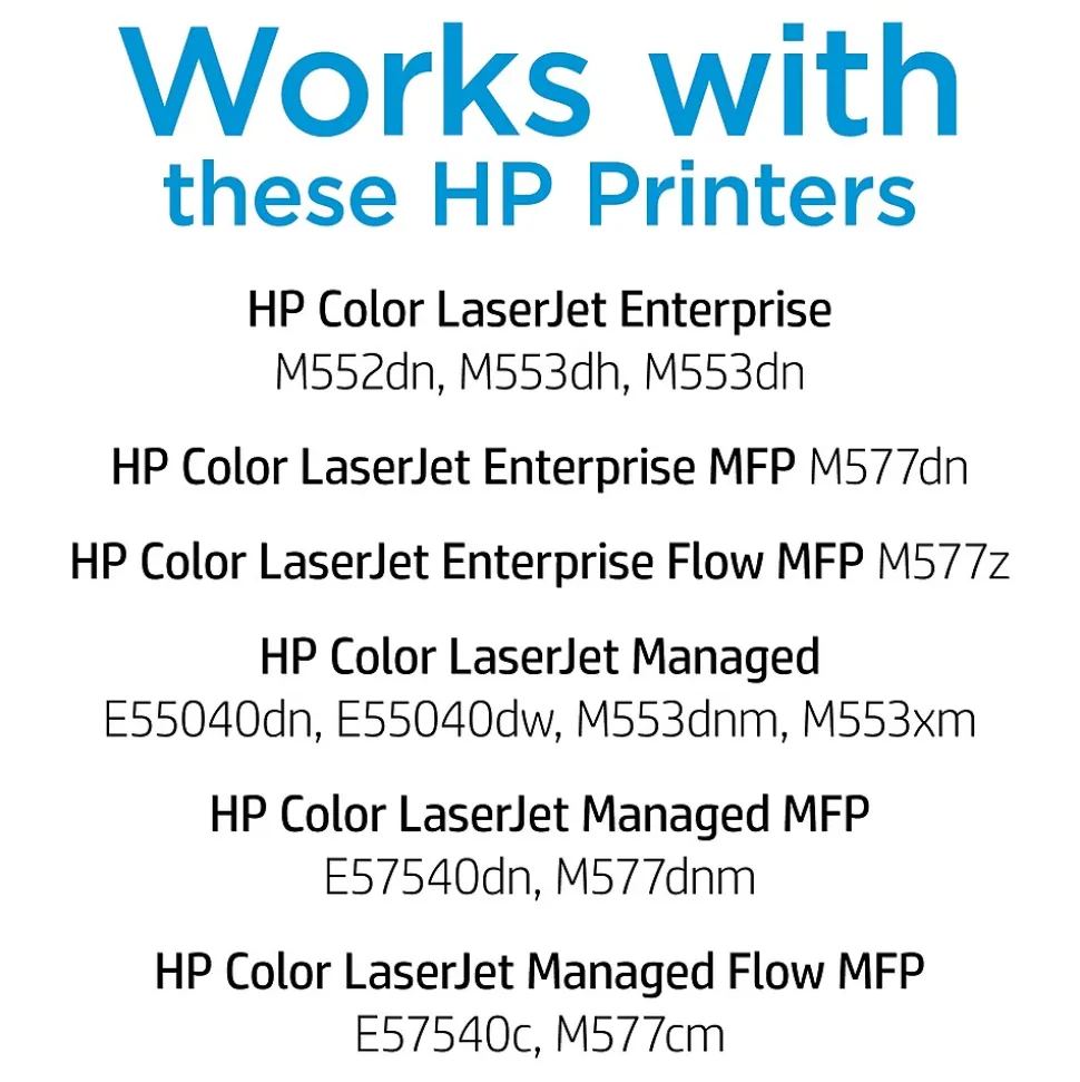 - Compatible with: Color LaserJet Enterprise M552dn, M553dh, M553dn, M553n, M553x, Color LaserJet Managed M553dnm, M553xm, Color LaserJet Managed Flow MFP E57540c, MFP M577cm, LaserJet Enterprise MFP M577dn, MFP M577f, LaserJet Enterprise Flow MFP M577c, MFP M577z, LaserJet Managed MFP E57540dn, MFP M577dnm