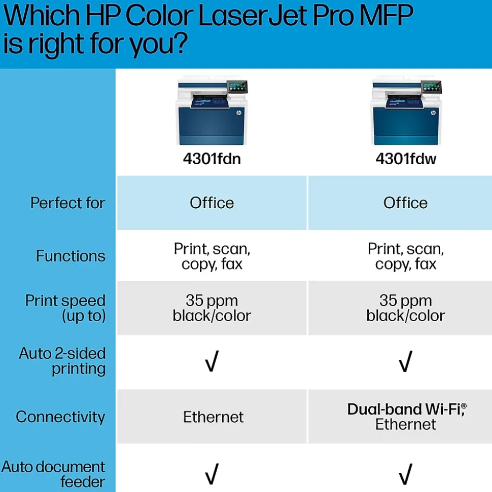 Get vibrant laser-quality color and powerful productivity with the Color LaserJet Pro MFP 4301fdw. Super fast and super easy with advanced features for small teams.