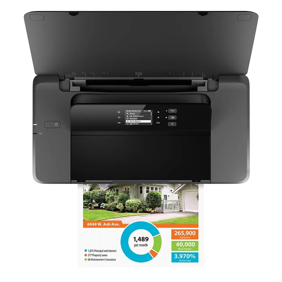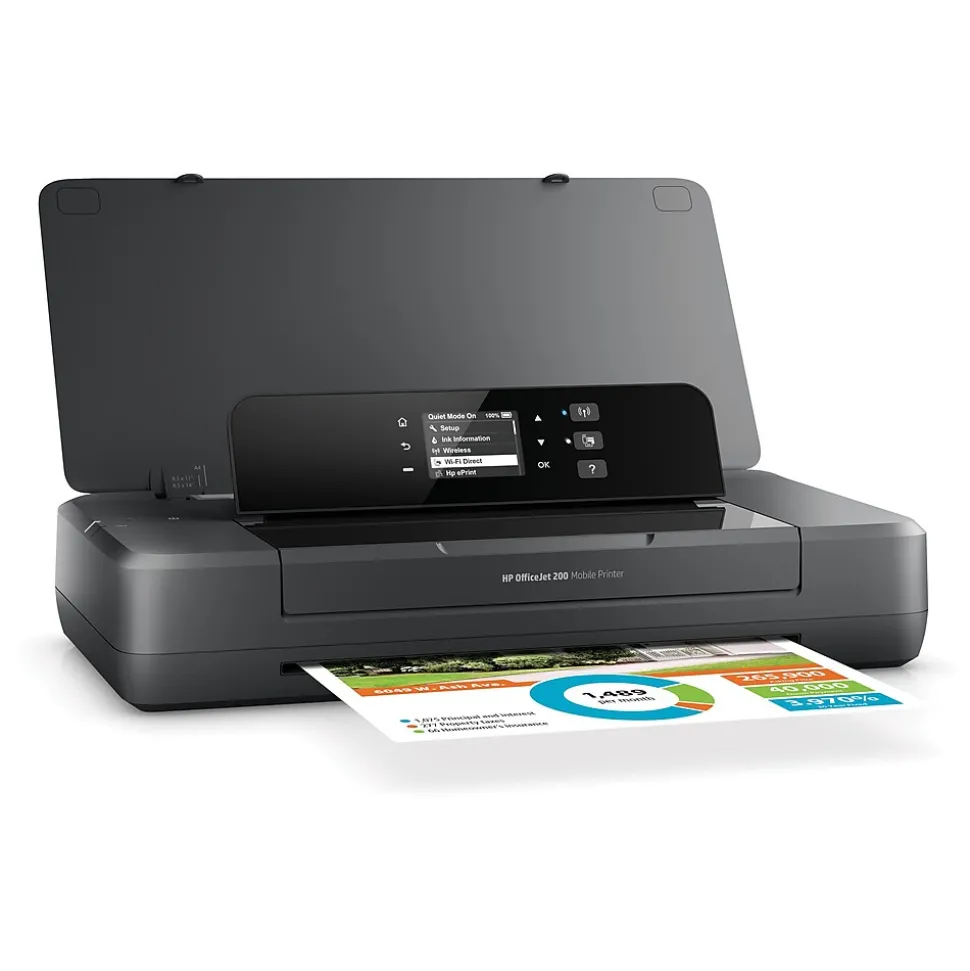 Unleash your printing capabilities with the HP OfficeJet 200 portable printer, designed for seamless business printing on-the-go. This single-function, inkjet officebusiness printer supports media types such as plain, HP photo, HP matte brochure or professional paper, HP matte presentation paper, HP glossy brochure or professional paper, and light/recycled materials. Weighing less than 5 pounds, the compact and durable HP OfficeJet 200 easily fits in your car or backpack for convenient printing anywhere you need it. Its wireless capabilities allow for effortless setup and fast printing from laptops or mobile devices – even without a network – thanks to features like wi-fi, wi-fi direct, and AirPrint. Enjoy uninterrupted, high-quality printing with the long-lasting battery, and navigate with ease using the large, 2-inch high-resolution touchscreen. Stay ahead of the curve with the HP OfficeJet 200 – the ultimate solution for portable and efficient mobile printing!