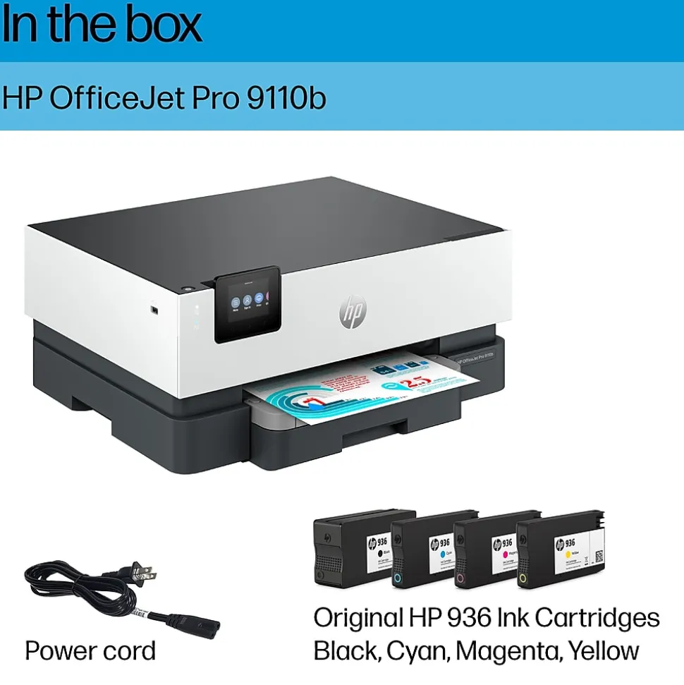 - WHAT’S IN THE BOX – 5A0S1A HP OfficeJet Pro 9110b Printer, Original HP 936 Ink Cartridges (black, cyan, magenta, yellow), user flyers, setup poster, power cord.