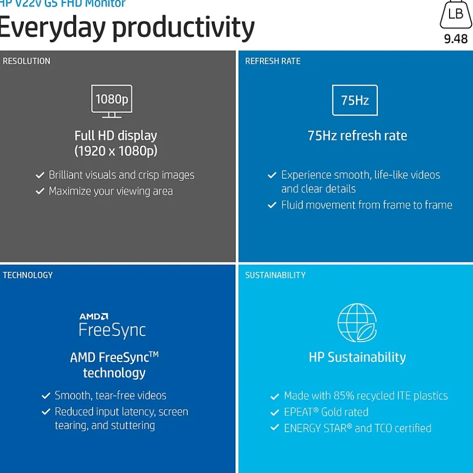 Do more when working or learning with the HP V22v G5 21.45″ FHD monitor through a crisp, smooth screen and simple design. Narrow bezel display: by squeezing a larger screen into a smaller frame, this narrow bezel optimizes your display’s appearance with an efficient design. It’s never been easier to configure your display’s settings right from the monitor. Simply navigate the on-screen menu with the joypad OSD button to adjust brightness, resolution, and volume. Be more productive with a cleaner workspace by removing the clutter of mixed cables with a neat cable management solution. Experience smooth, lifelike video and clear detail with a 75Hz refresh rate that provides fluid movement from frame to frame. AMD FreeSync technology provides smooth, tear-free videos by reducing input latency, screen tearing, and stuttering. Keep your eyes comfortable throughout the day by turning on Low Blue Light mode to subtly shift display colors to a warmer spectrum. Customize your display with easy, intuitive HP Display Center software that lets you tailor your settings, partition screens, and even dim the screen, all through the host PC. This monitor meets the energy efficiency and environmental standards for tech and IT with EPEAT Gold rating and ENERGY STAR and TCO certifications.