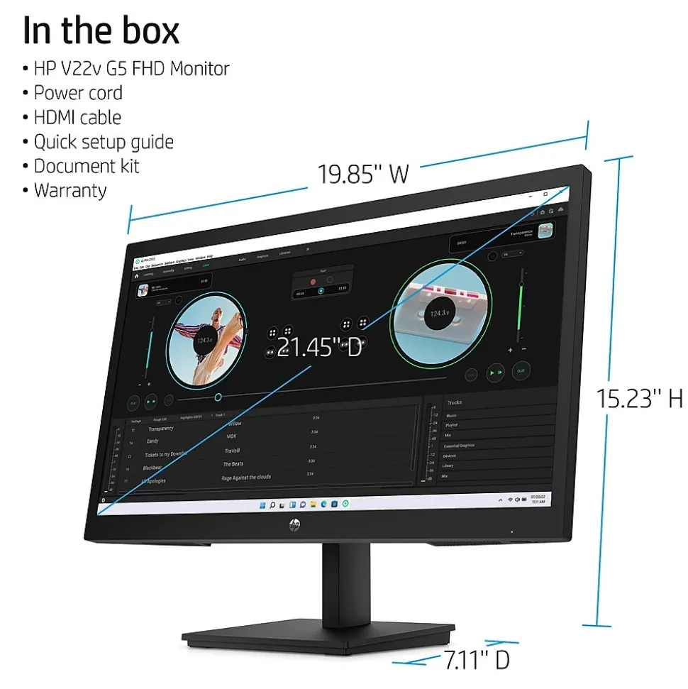 - Package includes: HP V22v G5 monitor, HDMI cable, Document kit, and software