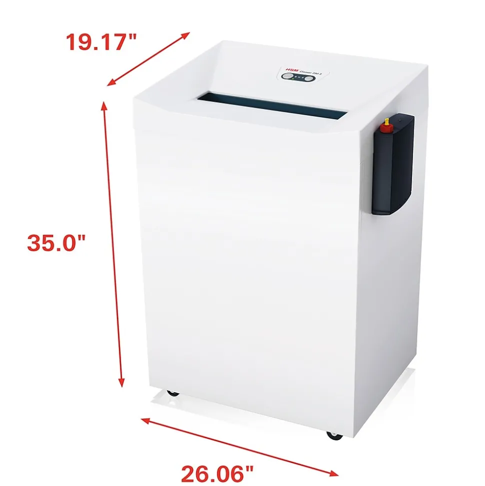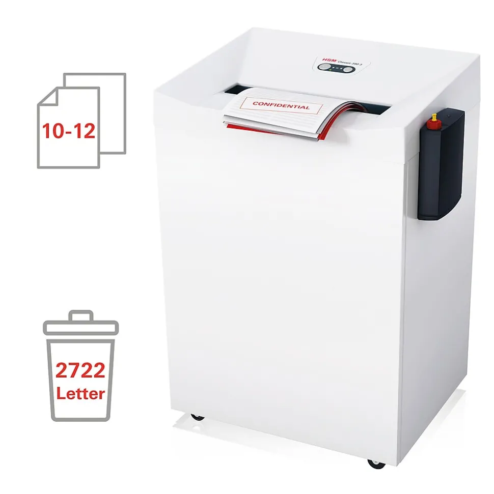 HSM 390.3L6, 12 sheet high security shredder has a 39 gallon capacity. NSA approved and makes paper particle reassembly impossible.