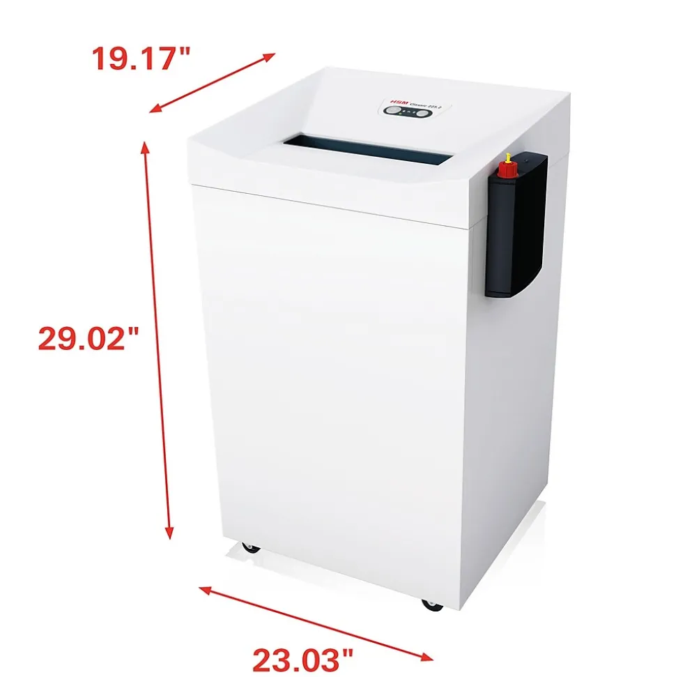 HSM 225.2L6, 12 sheet high security shredder has a 31.7 gallon capacity. NSA approved and makes paper particle reassembly impossible.