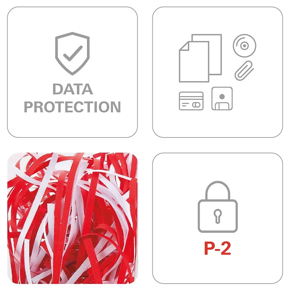 - Optimized cutting device technology destroys 43-49 sheets of paper, creating 38 strip-cut particles per page