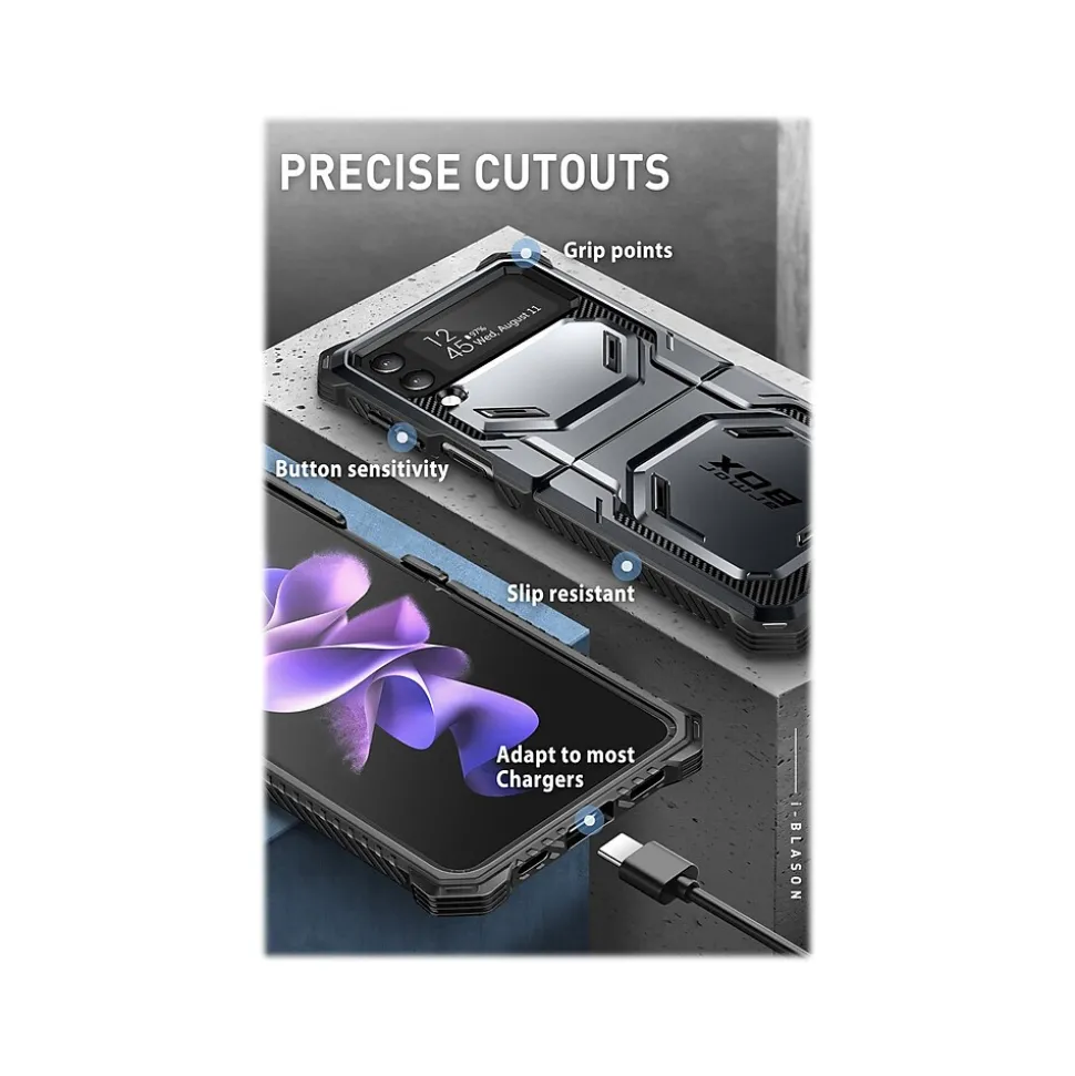 The i-Blason Armorbox rugged case ensures 360-degree full-body protection for your Samsung Galaxy Z Flip4 5G (2022). Precise cutouts allow seamless access to all ports and features. Exceeds military drop standards: drop-tested at 48″ height, 26 times.