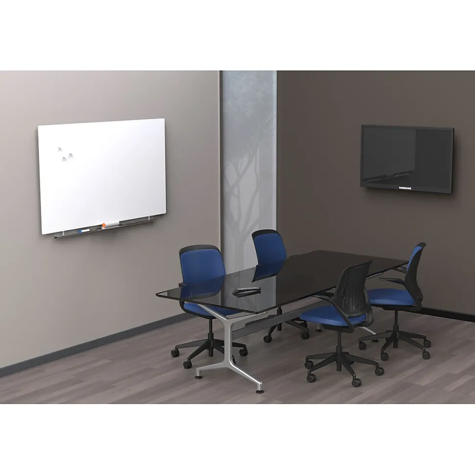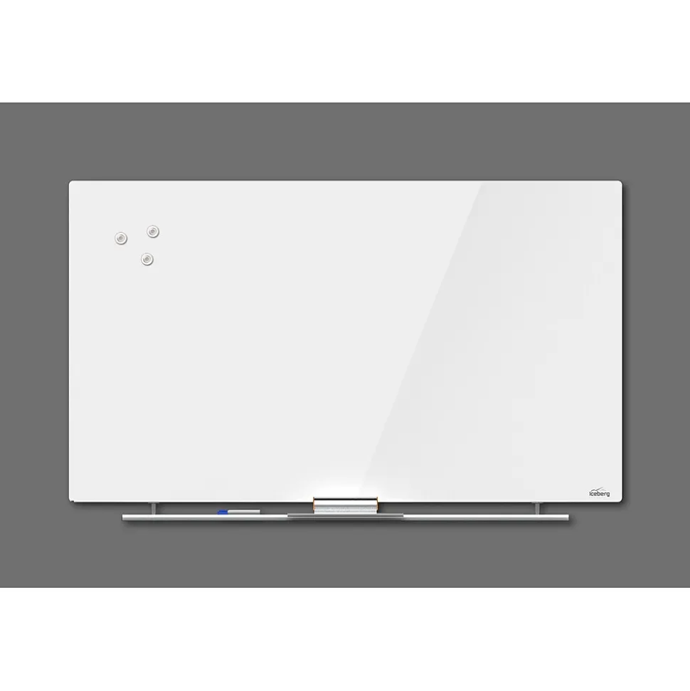 Iceberg Clarity Magnetic Glass Dry Erase Board in Cinema wide format is optimal for viewing and writing. Low iron, ultra clear tempered safety glass with distinctive arctic white backing, results in a crisp, vibrant and easy to read surface. Glass is stain free and erases clean with ease. Magnetic glass surface doubles as a place to share, and post, brainstorming ideas and inspirations. Sleek, stunning aluminum marker rail floats below the glass surface keeping markers and erasers out of the way. Includes an Ergo-grip aluminum eraser, 2 hi-powered magnets and a black dry erase marker.