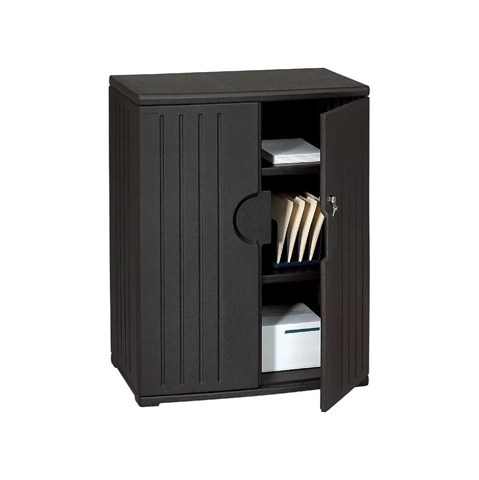 Iceberg Storage cabinet in black color measuring 46″ x 36″ x 22″ is includes three shelves, two adjustable shelves that can securely holds up to 75 lbs. Cabinet is easy to clean and offers resistance towards chemicals.