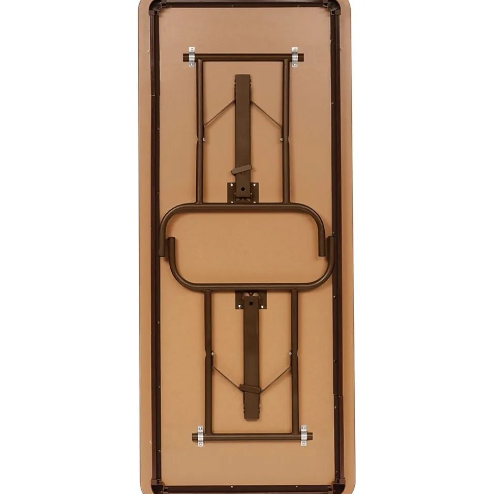 - Folding tables feature a wear-resistant, 3/4″ top surface; laminated melamine over particle board with a melamine-sealed underside and bull-nose vinyl T-mold edging