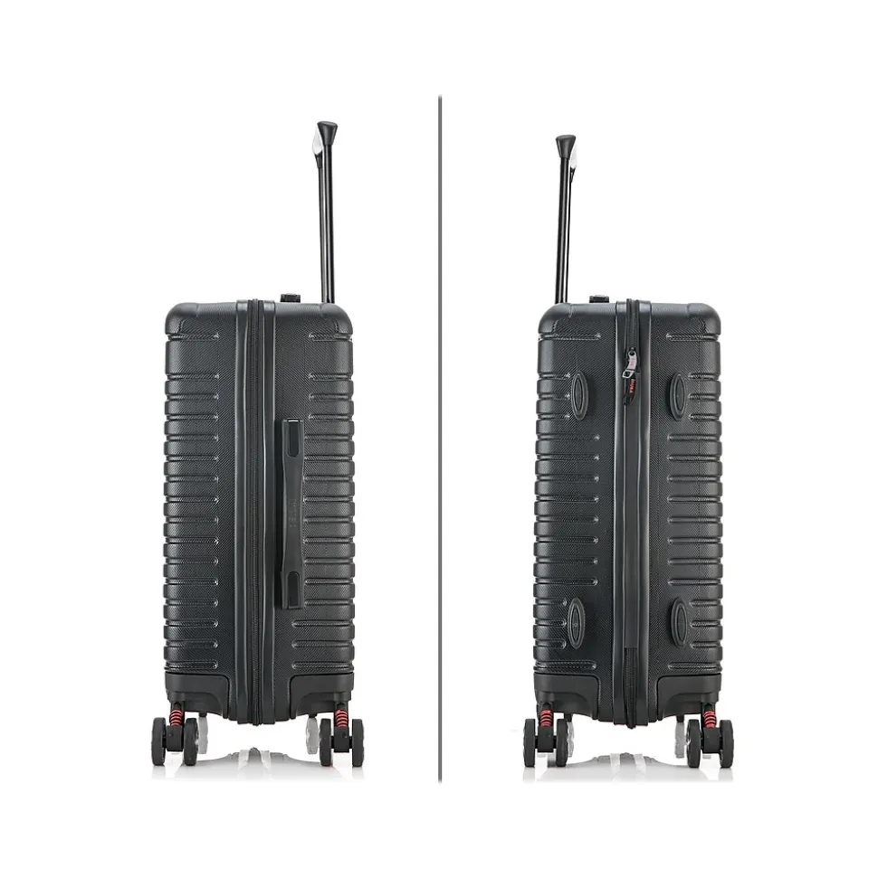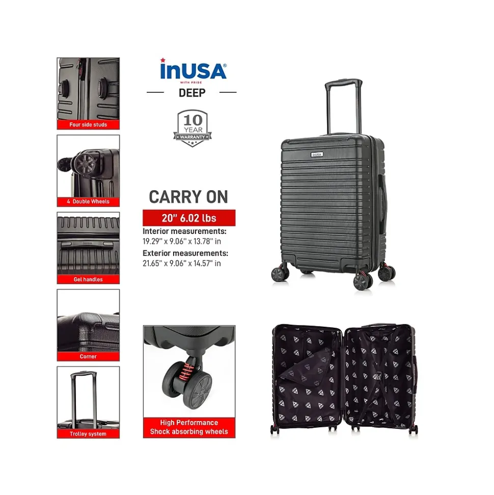 The InUSA Deep 20″ carry-on luggage features a contemporary, impact-resistant, and functional design. The suitcase is made of engineered material with a micro-diamond finish. The hard-flex construction offers maximum strength, durability, and a water-/scratch-resistant finish. Top and side ergonomic gel handles ensure comfortable and easy luggage lifting. It comes equipped with a push-button locking internal retractable trolley system. Features smooth-gliding self-repairable oversized zippers.