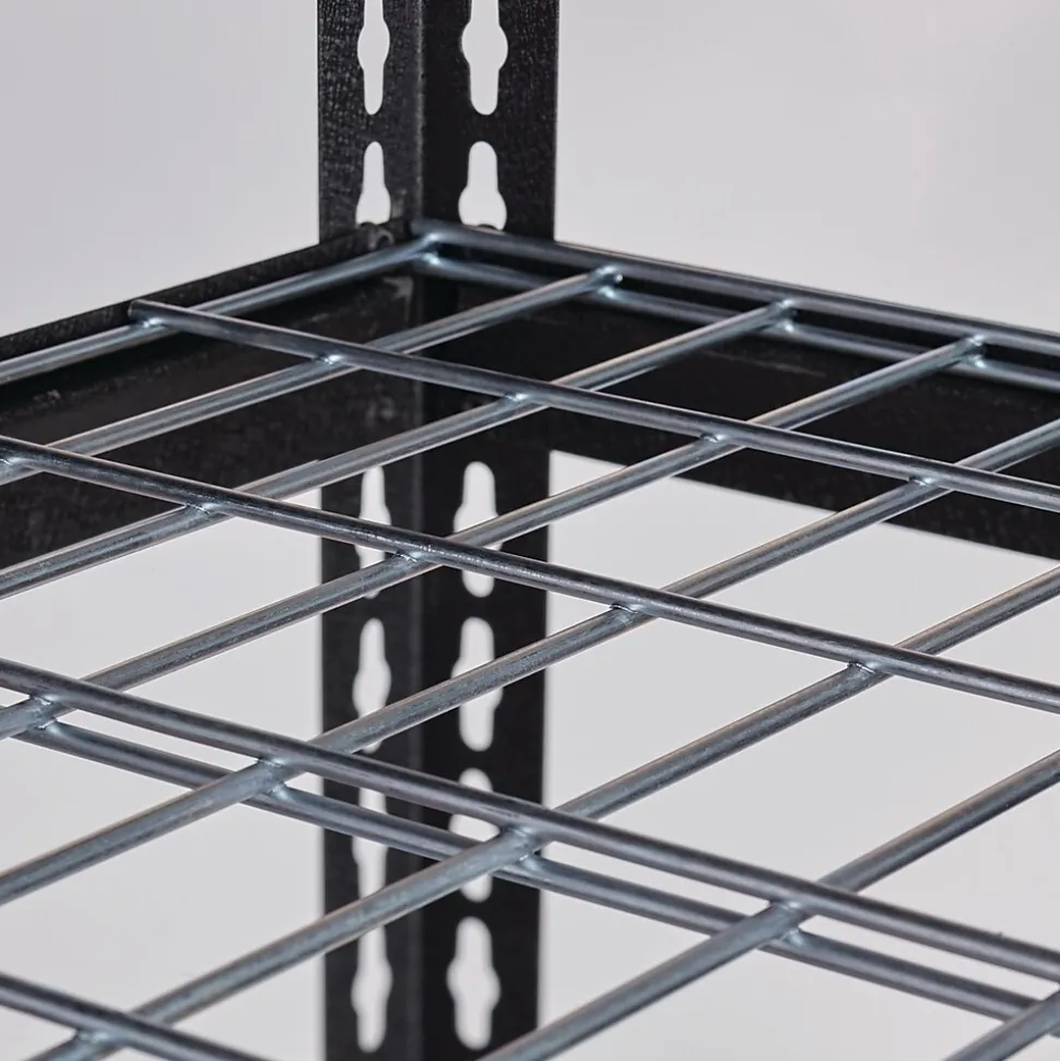 Wire Deck Shelving units are a great solution to your home storage needs. When you are looking for solutions for your garage, storage room or kitchen, this wire shelving unit can hold a total capacity of 2,300 lbs. of evenly distributed weight. The zinc coated wire shelving makes each shelf easy to clean and disinfect. Shelving unit can be assembled either vertically or horizontally to suit your needs. The simple, bolt-less design makes it easy to assemble with only a rubber mallet (not included). Black crinkle coat posts are durable and rust resistant.